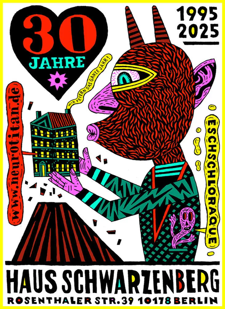 In einer von vielfältigen Krisen geprägten Realität setzen Vergangenheit, Gegenwart und Zukunft des Haus Schwarzenberg ein Zeichen für Vielfalt und Freiheit und spielen auch während des Jubiläums ineinander: Die zentrale Plattform freien Kunstschaffens und künstlerischer Selbstverwirklichung bildet der vereinseigene Ausstellungsraum Neurotitan, in der wir drei interdisziplinäre Jubiläumsausstellungen präsentieren. Sie zeigen die aktuelle Bedeutung von soziokulturellen Freiräumen; hinterfragen unabhängige künstlerische Existenz im Kontext von Kreativwirtschaft und nachhaltiger Zukunft und lassen die bis heute im Haus spürbaren, initialen Jahre ungezähmter Nachwendezeit widerhallen.