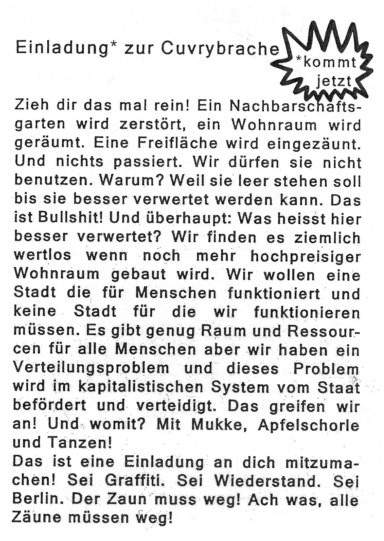 Versuchte Neubesetzung der Cuvrybrache. Von der anwesenden Polizei verhindert.