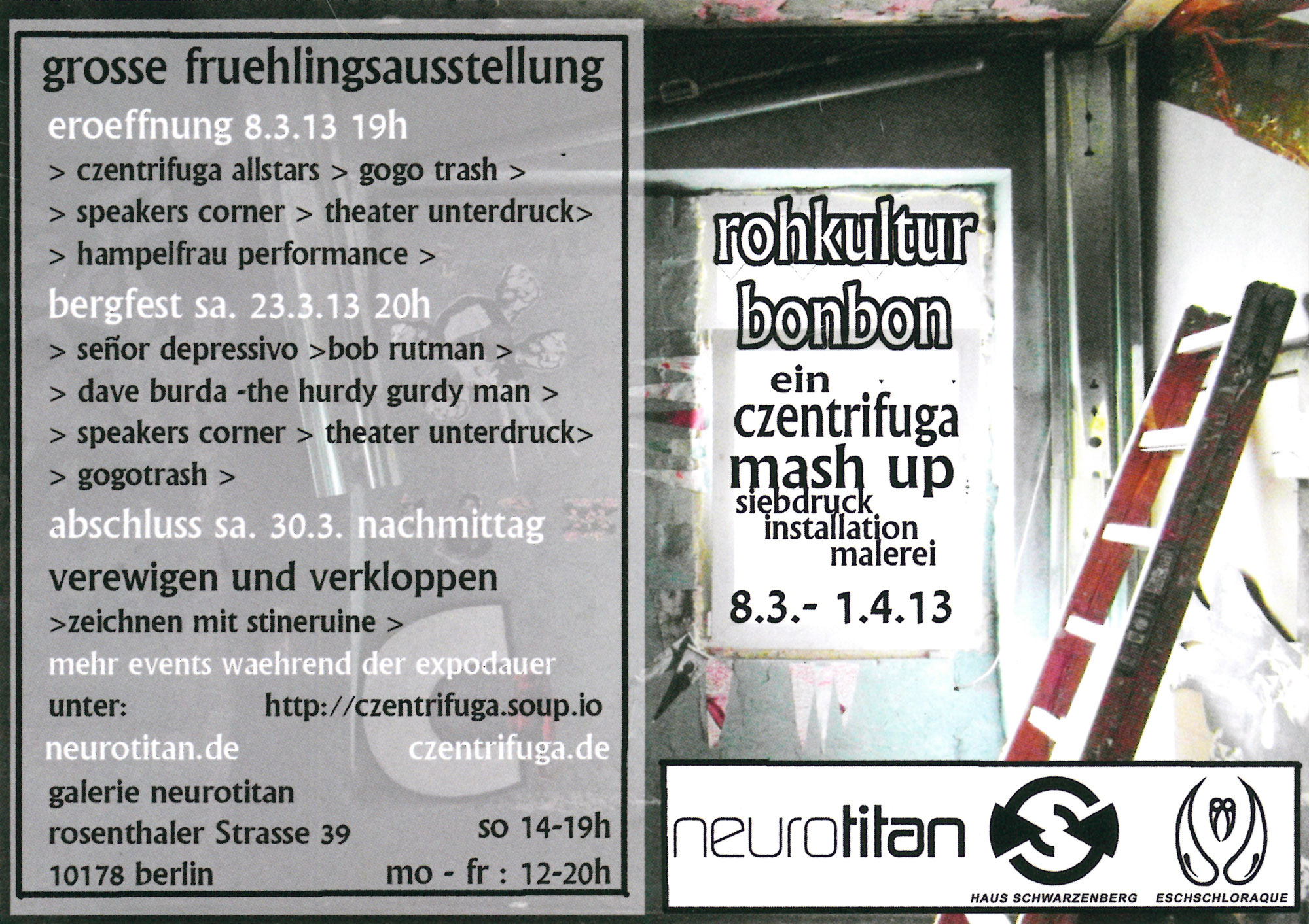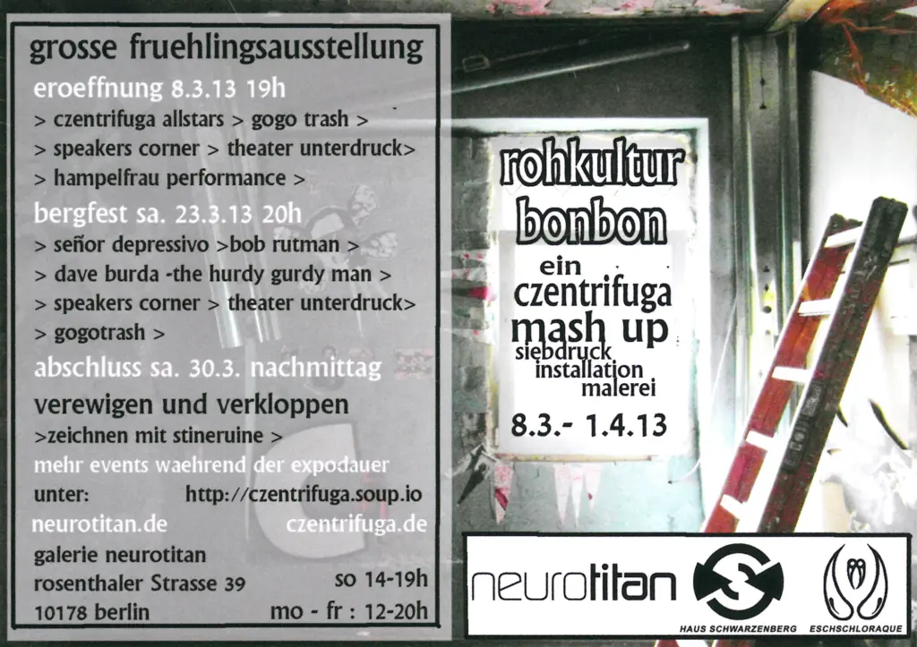 2010 folgte dann der nächste Umzug, diesmal ans Ostkreuz: angefangen hat diese neue Phase mit der Schrumpfung zur CZentrifuga Czentrale, Siebdruck minimal und vielen Reisen im zuge einer Grundtvig -Förderung, wobei ein erweitertes europäisches Netzwerk mit anderen D.I.Y Projekten entstand.