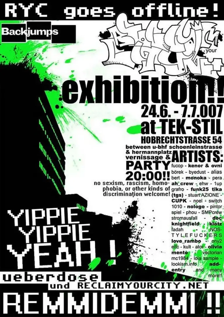 Die Urban Art Ausstellung im E-Werk. Großer Saal 18.-26. Juni 2003. Täglich von 14.00 - bis 23.00 h. ///// Freier Eintritt. /////////Plakate, Aufkleber, Graffities & Schablonities von Swoon (USA), Wadw, Idiot, Akroe, Loesje International, Duck (Belgien), Meat Love, Sat One, Karski (Holland), Akayism (Schweden), Os Gemeos (Brasilien), Keinom, Daim, (…