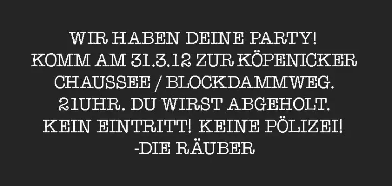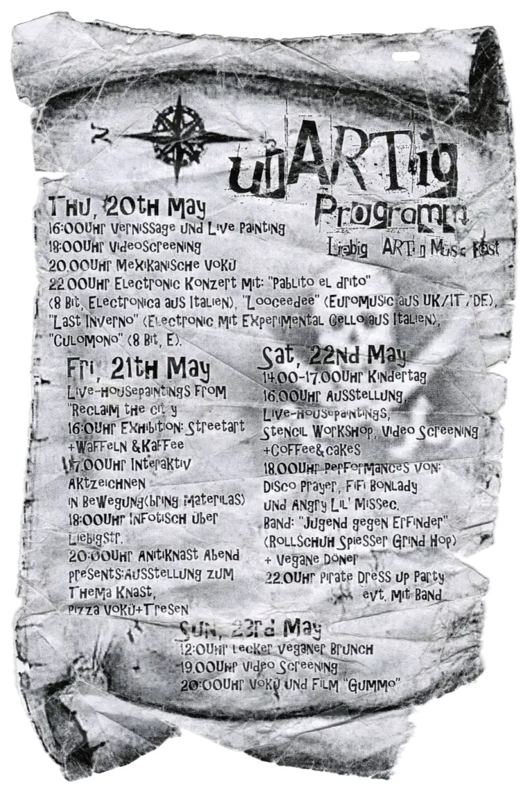 Anti-Räumungsfestival des ReäuberLäbs gegen die drohende Räumung des Geländes. SAMSTAG 21.07… KiNO FÜR ALLE AB 22UHRSONNTAG 22.07… AB 13UR MUSiKALiSCHES PIPAPO _LiVE!17 UHR OFFENES PLENUMMONTAG 23.07.. AB 13UHR DJANES UND BANDS MiT WUMMMSDiENSTAG 24.07… -RÄUMUNG VERHiNDERN-