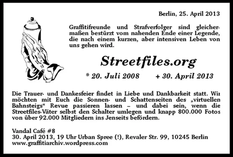 Graffitifreunde und Strafverfolger sind gleichermaßen bestürzt vom nahenden Ende einer Legende, die nach einem kurzen, aber intensiven Leben von uns gehen wird.Streetfiles.org (20. Juli 2008-30. April 2013)Die Trauer und Dankesfeier findet in Liebe und Dankbarkeit statt. Wir möchten mit Euch die Sonnen- und Schattenseiten des Bahnsteigs" Revue passieren lassen –…