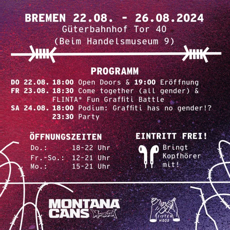 BREMEN 22.08. - 26.08.2024Güterbahnhof, Tor 40 (Beim Handelsmuseum 9)PROGRAMMDO 22.08. 18:00 Open Doors & 19:00 EröffnungFR 23.08. 18:30 Come together (all gender) & FLINTA* Fun Graffiti BattleSA 24.08. 18:00 Podium: Graffiti has no gender!?23:30 PartyÖFFNUNGSZEITENDo.: 18-22 UhrFr. -So.: 12-21 UhrMo. : 15-21 UhrEINTRITT FREI!Tor 40 im Güterbahnhof BremenBeim Handelsmuseum 929195…