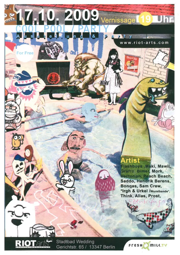 Kollektiv-Ausstellung im Schwimmbecken vom ehemaligen Stadtbad Wedding.Poster und Organisation: Sam Crew.Artist:Flashboys ,Maki, Mawil, Grafro, Bimer, Mork, Vectorian, Peach Beach, Saddo, Hendrik Berens, Bongas, Sam Crew, Irgh & Urkel /Wurstbande, Think, Alias, Prost, CzentrifugaStadtbad WeddingGerichtstr. 65 / 13347 Berlin