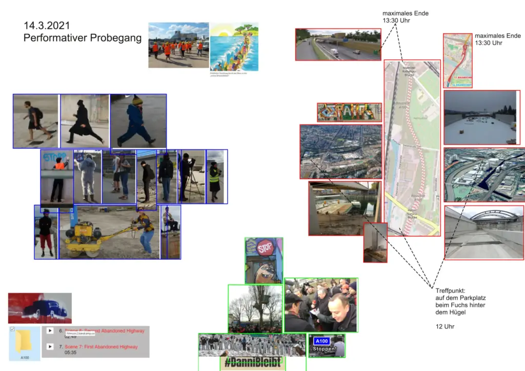 Besonders an den Wochenenden wurde die Autobahn von Spaziergänger*innen genutzt, die von Neukölln zum Treptower Park liefen. Der verwaiste Hotel-Parkplatz konnte zum pandemie-konformen Grillen und Biertrinken genutzt werden, auch für spontane Konzerte, nachdem eine funktionierende Steckdose am leeren Parkplatzwächter-Häuschen entdeckt wurde. An einem Sonntag im März 2021 ging eine Parade auf die Autobahn. Die Teilnehmer*innen verkleideten sich als Autos, brachten Mal-Utensilien, aber auch Musikinstrumente und Tonabnehmer mit, mit denen sie die Rohre und Hohlräume auf der Baustelle zum Klingen brachten. Eine nur für diesen Anlass gebaute Augmented-Reality-App für die mitgebrachten Smartphones ließ virtuell Autos auf der Fahrbahn fahren, die aber ständig im Stau standen und regelmäßig hupend zusammenstießen. Leider stoppte die Polizei die Parade auf halber Strecke, die plötzlich brüllend auf der Brücke darüberstand. Der Freude über den Ausflug tat das keinen Abbruch. In ein paar Jahren, wenn hier 24 Stunden am Tag nur noch Autos entlangbrettern und auf dem Parkplatz eines der höchsten Hotel-Gebäude Berlins stehen wird, werden wir uns daran erinnern, ausgerechnet an diesem Ort eine ganz andere Realität gelebt und sichtbar gemacht zu haben.