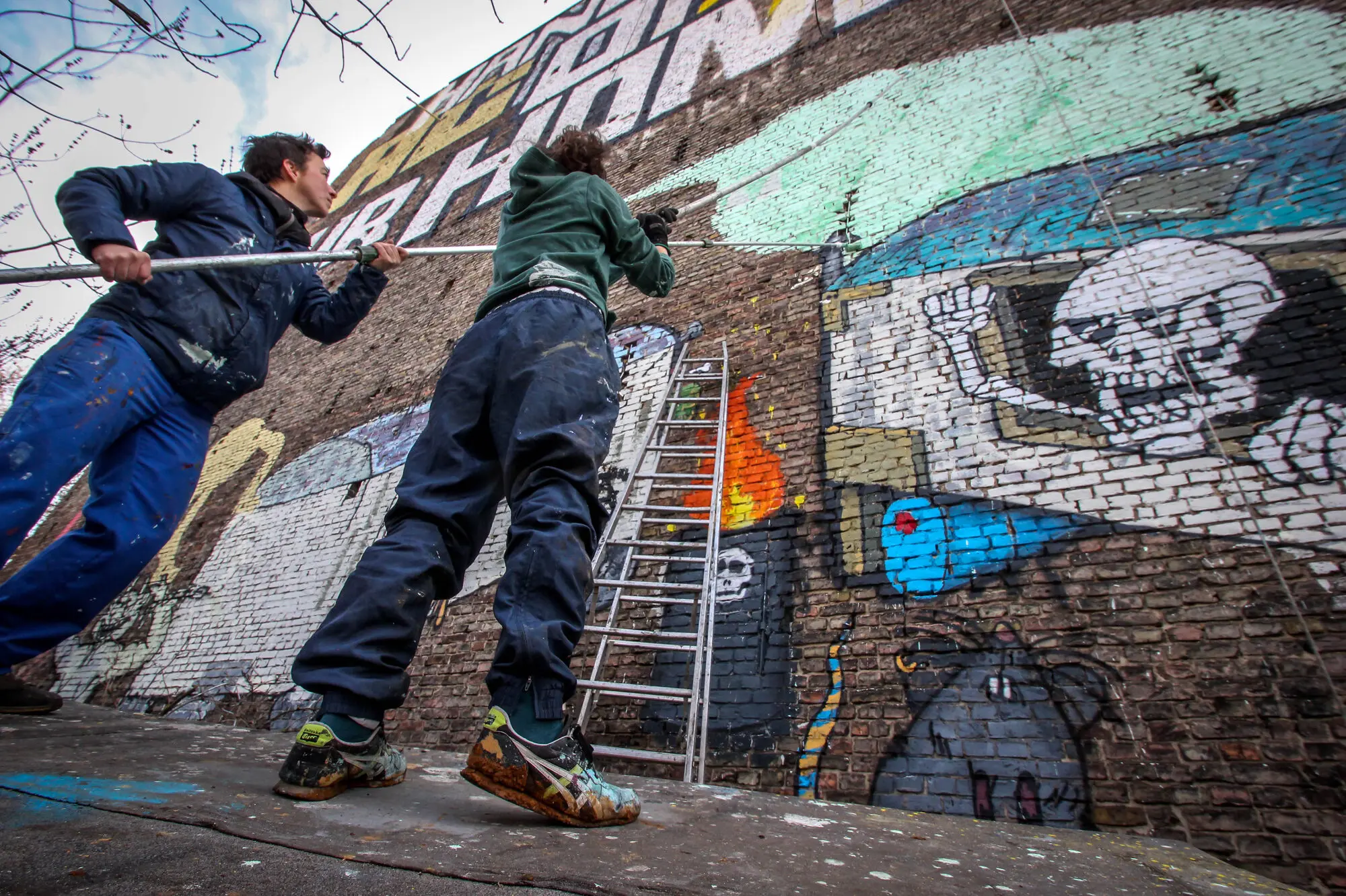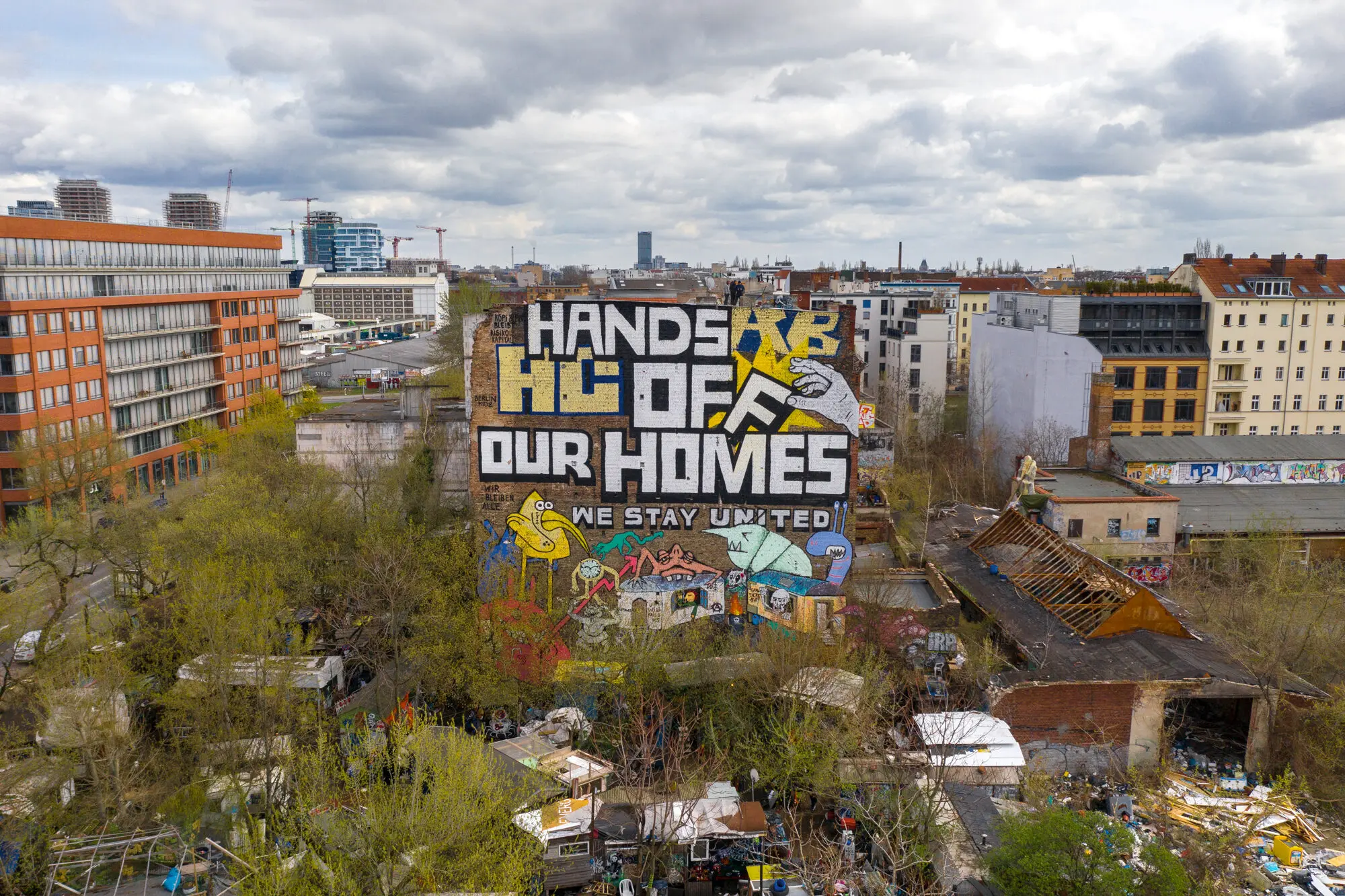 Das Wandbild ist aus der Idee heraus entstanden, mehr Öffentlichkeit für diesen Freiraum herzustellen und deutlich sichtbar zu machen, dass es Alternativen zur kapitalistischen Stadtentwicklung gibt, die wichtig sind zu verteidigen. Gemalt wurde es innerhalb einer Woche von einem Zusammenschluss Berliner Sprayer*innen, Wandmalgruppen und Künstler*innen, die sich mit dem Ort seit vielen Jahren verbunden fühlen. Sie sind wie viele andere mit ihm großgeworden, haben dort gefeiert, gelebt und gearbeitet und werden es weiterhin tun.
