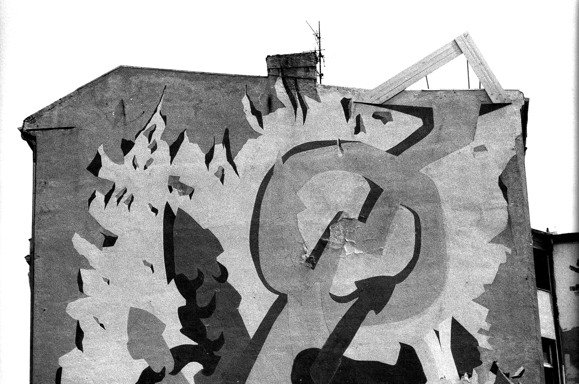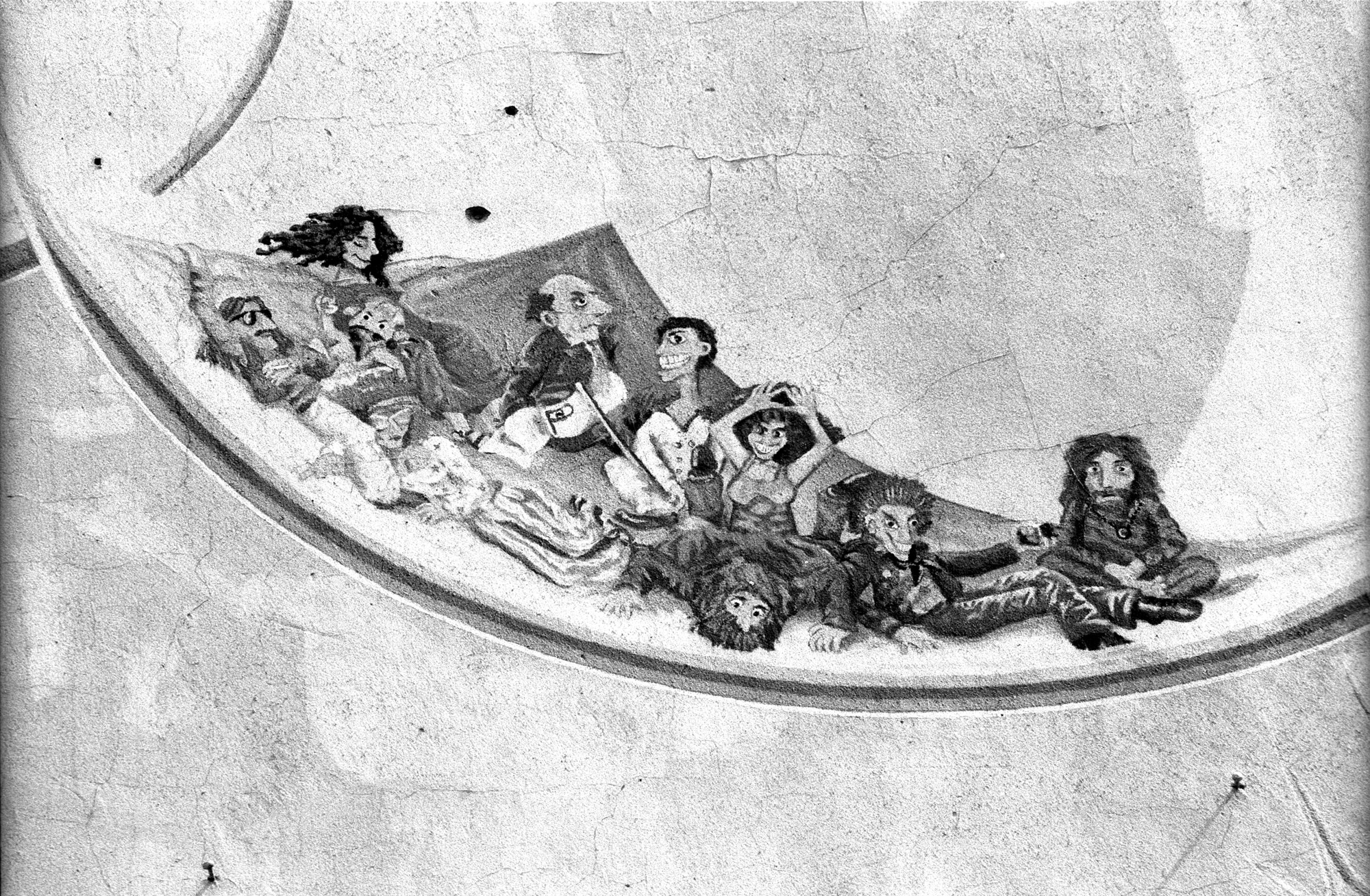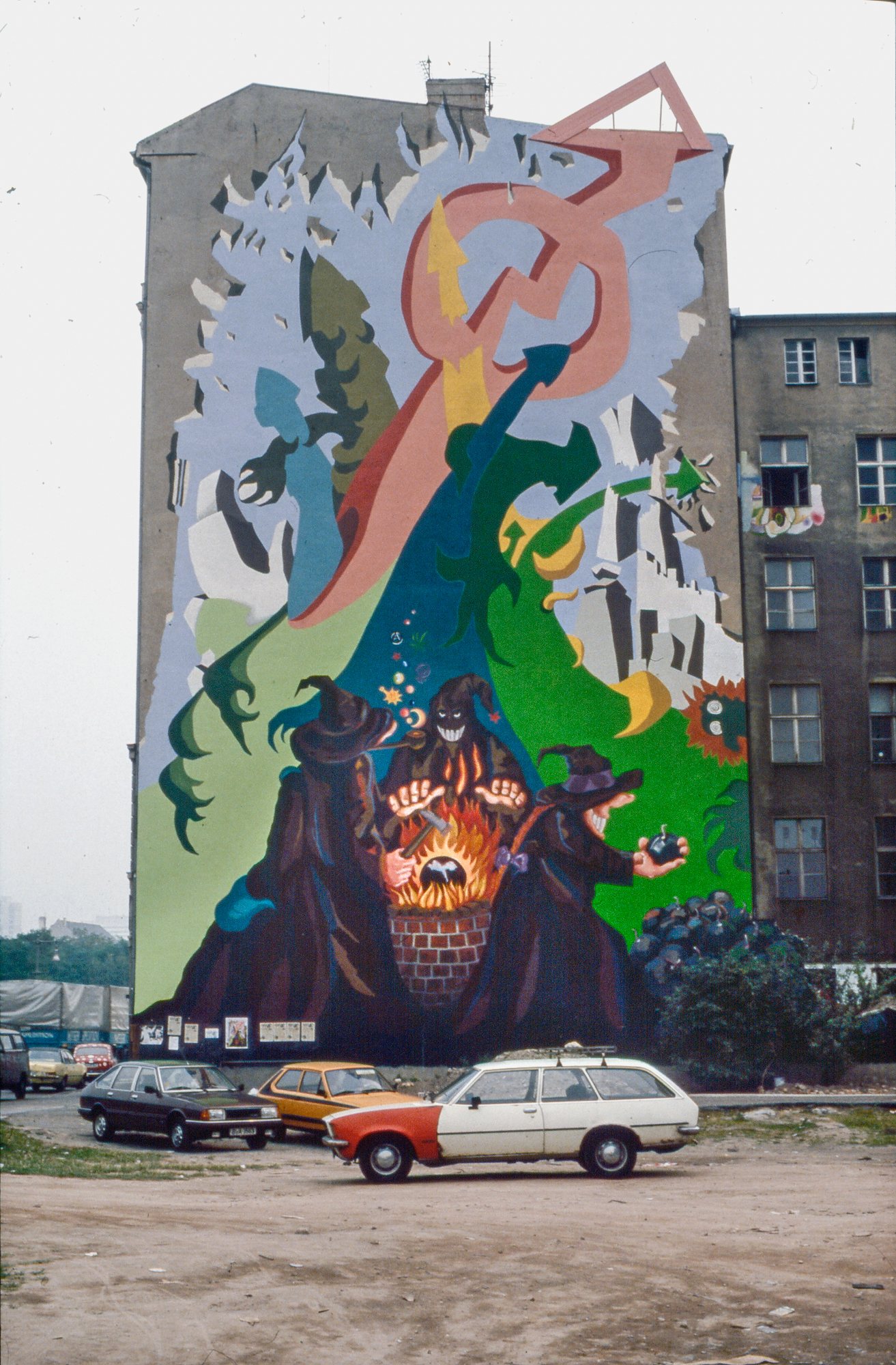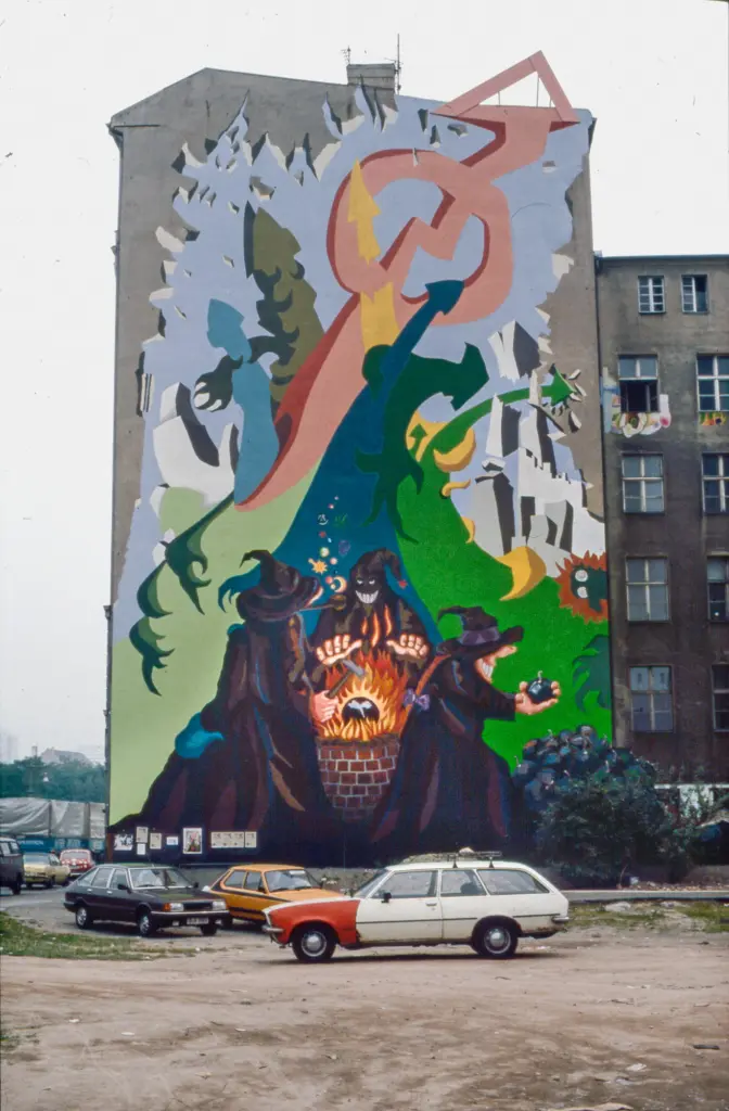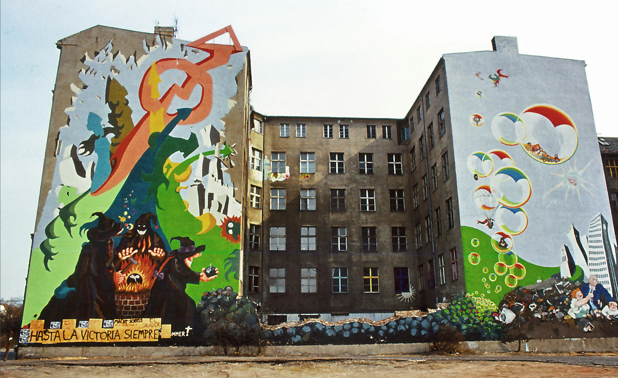 Das Fassadenbild des ehemaligen Kunst- und Kultur-Centrums Kreuzberg (KuKuCK, besetzt 1981) in der Anhalter Straße 7 in Berlin, zeigt hämisch grinsende Gestalten, die um einen Hexenkessel stehen, hinter dem das Zeichen der Hausbesetzer im Rauch emporsteigt.
