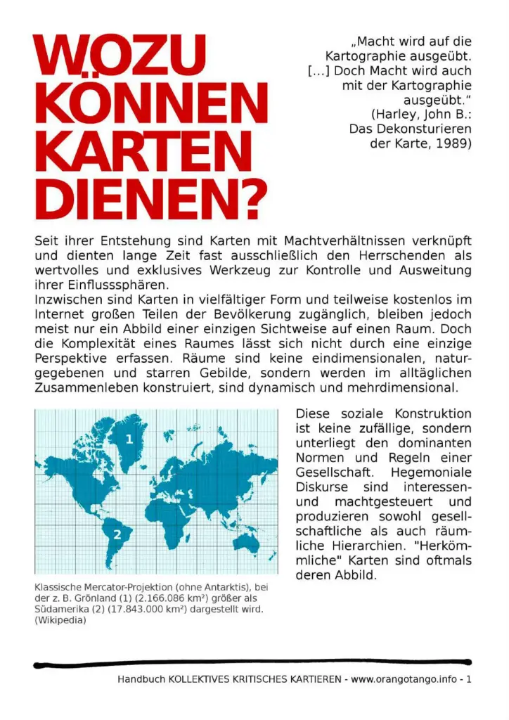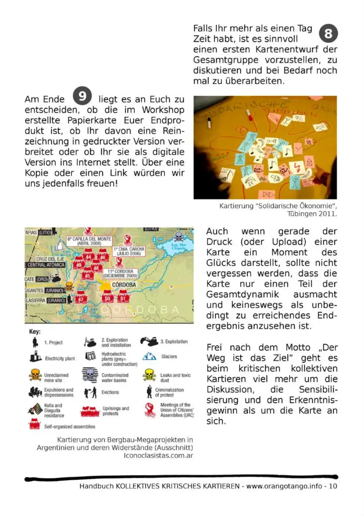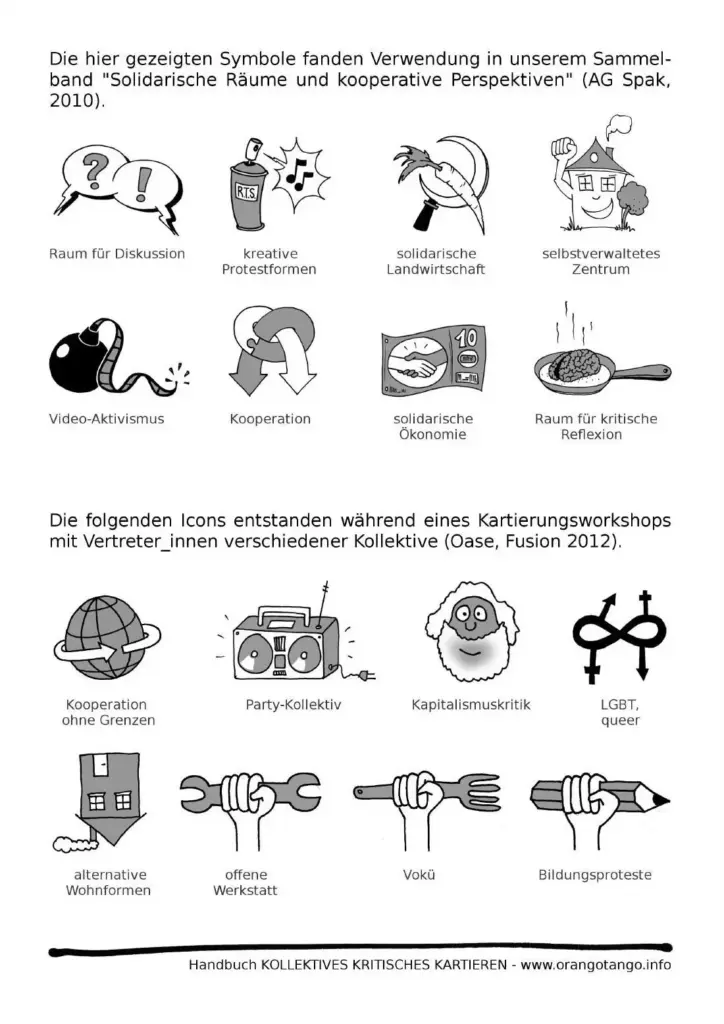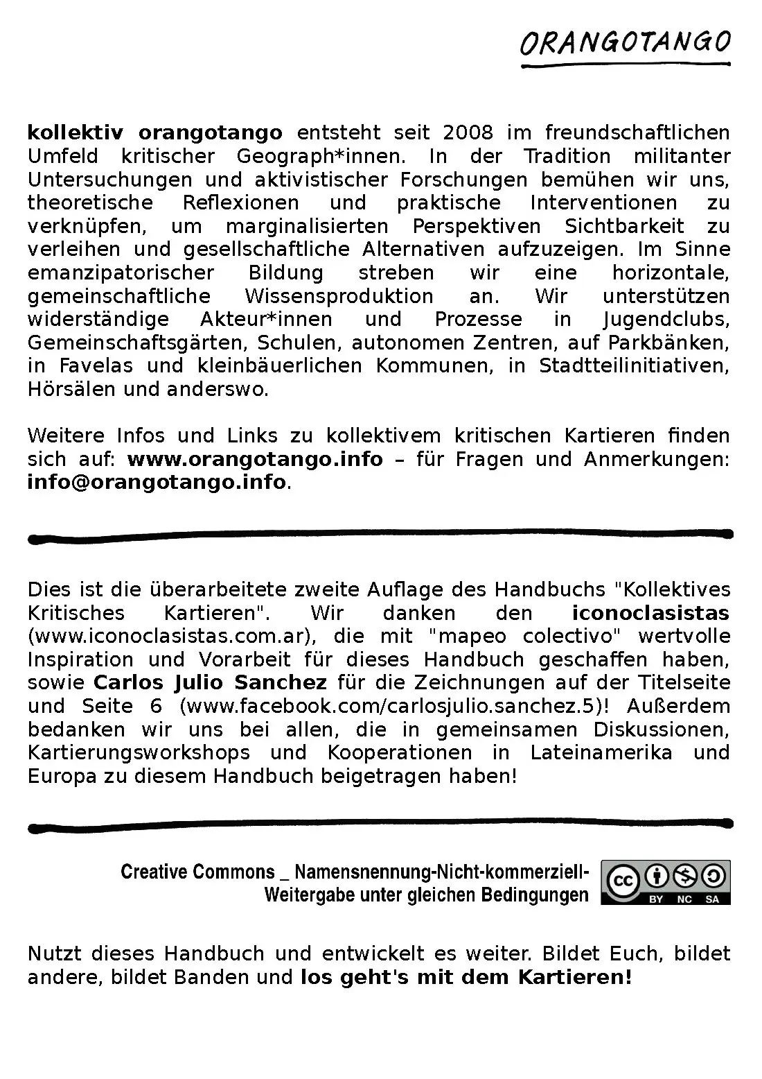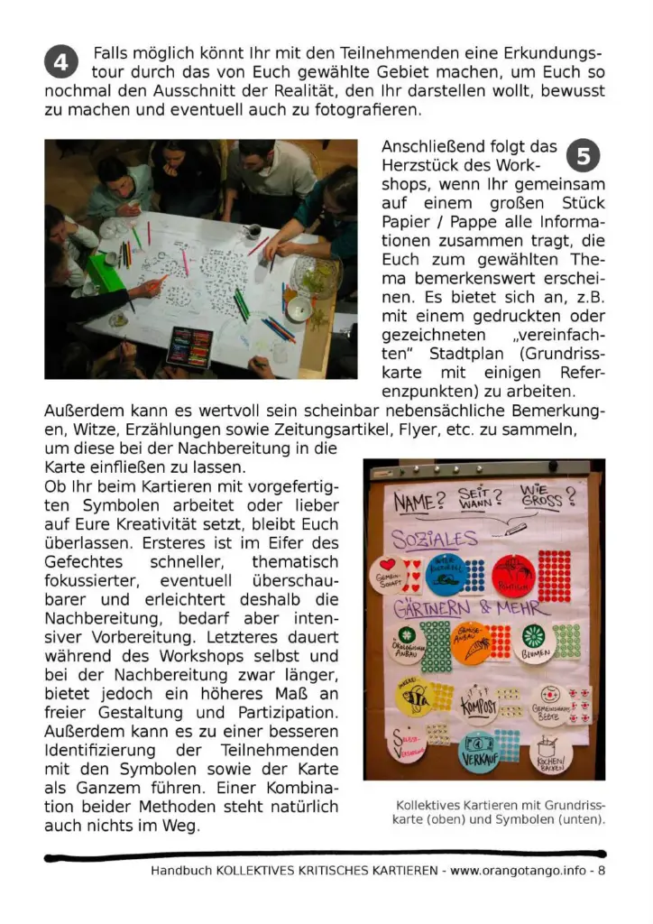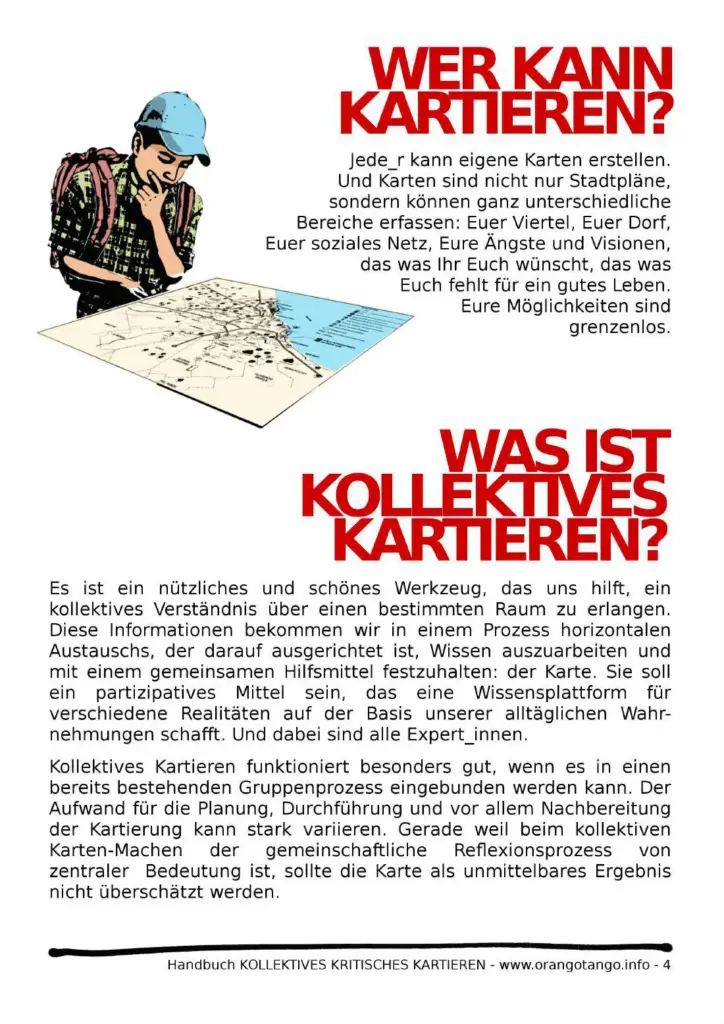 Inspiriert vom „mapeo coletivo” der Iconoclasistas aus Buenos Aires hat kollektiv orangotango das „Handbuch Kollektives und Kritisches Kartieren” entwickelt. Es enthält Vorschläge, wie sich durch Kartierung politische Praxis inspirieren kann, um Realitäten zu verändern. Das Handbuch ist mittlerweile auch auf Englisch, Belarussisch, Französisch und Italienisch verfügbar.