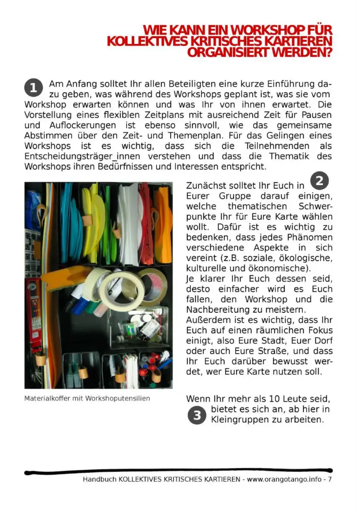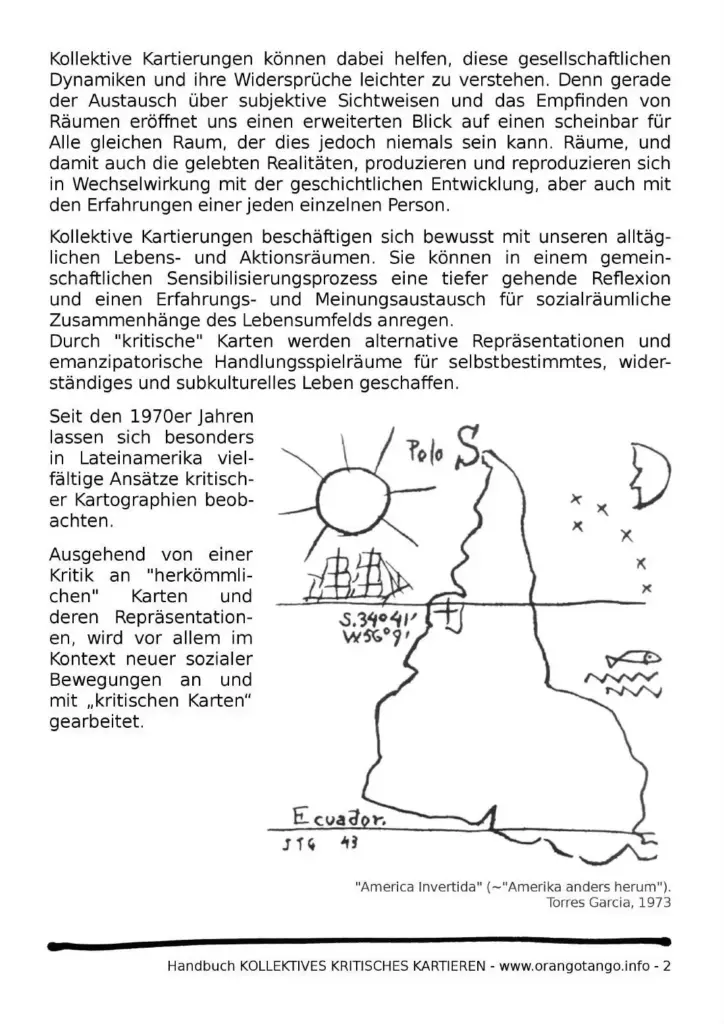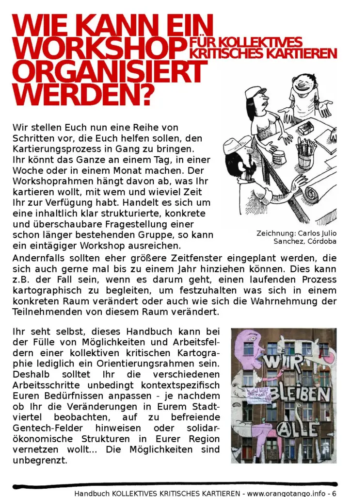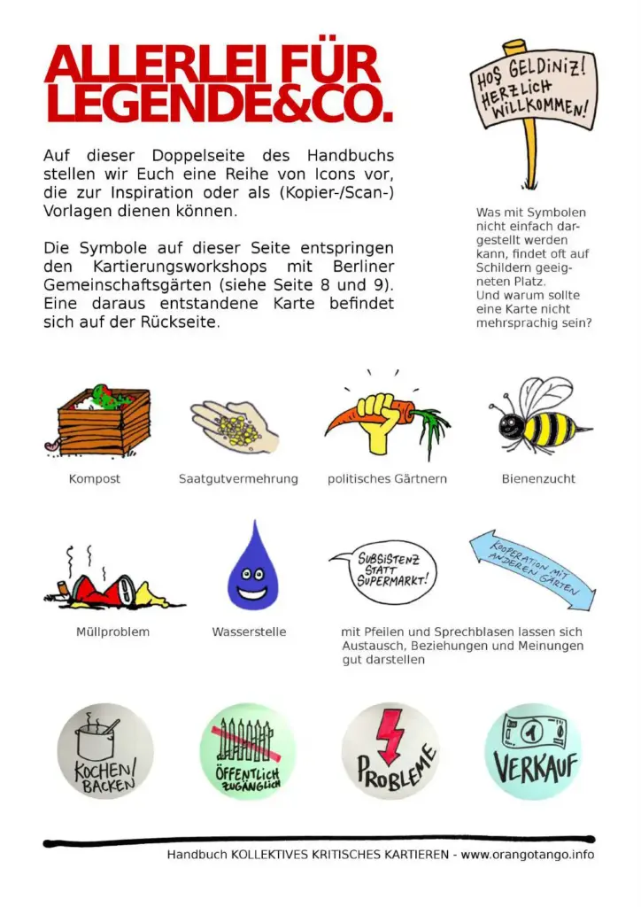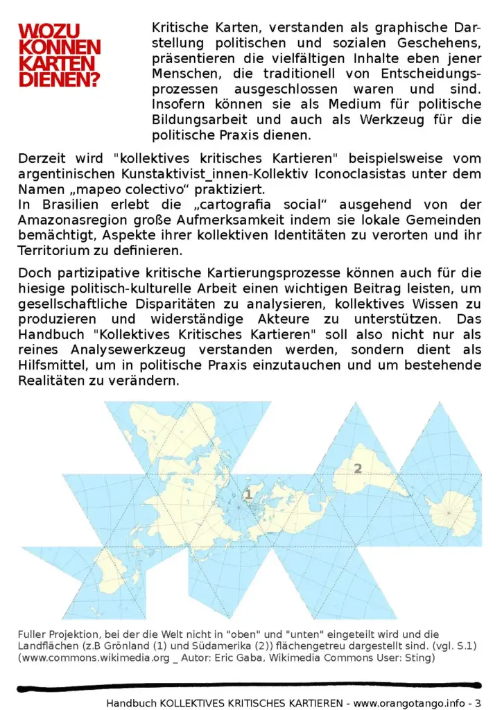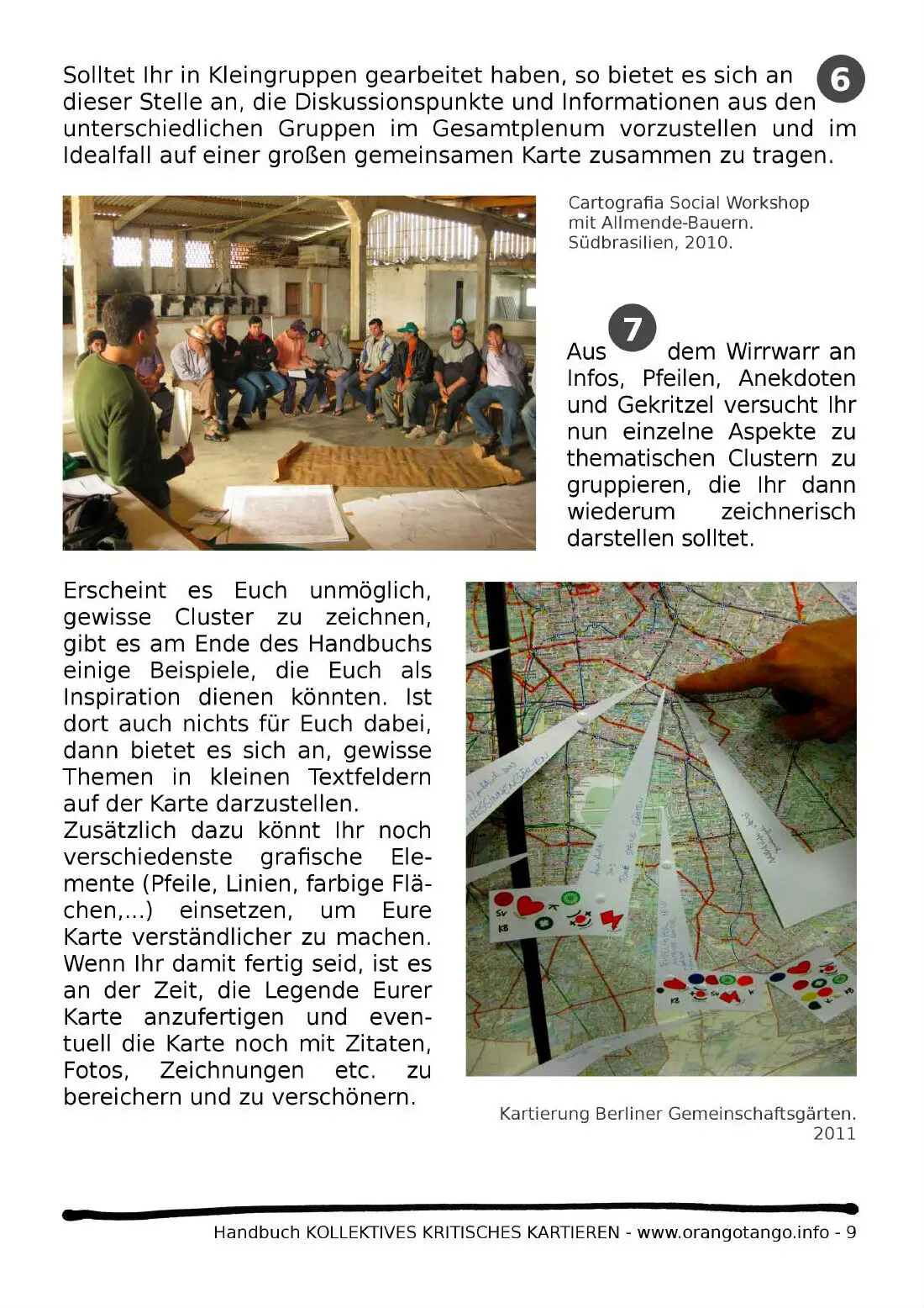 Inspiriert vom „mapeo coletivo” der Iconoclasistas aus Buenos Aires hat kollektiv orangotango das „Handbuch Kollektives und Kritisches Kartieren” entwickelt. Es enthält Vorschläge, wie sich durch Kartierung politische Praxis inspirieren kann, um Realitäten zu verändern. Das Handbuch ist mittlerweile auch auf Englisch, Belarussisch, Französisch und Italienisch verfügbar.