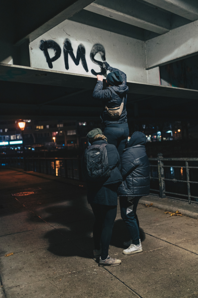 Die PMS Crew ist eine explizit feministische Graffiti-Crew aus Berlin. Seit 2019 malen sie unter diesem Namen Wandsprüche und Namens-Schriftzüge, um den Stimmen von FLINTA* (Frauen, Lesben, Intergeschlechtliche, nichtbinäre, trans und a-gender Personen) Sichtbarkeit zu geben, ein Gegengewicht zur männlich-dominierten Szene zu bilden und den Kampf gegen patriarchale Machtstrukturen in die Öffentlichkeit zu tragen.