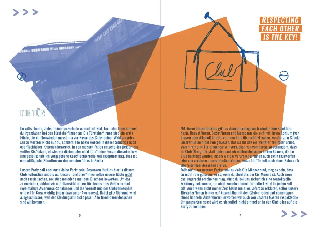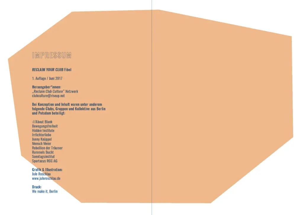 Die RECLAIM YOUR CLUB Fibel ist ein Gemeinschaftswerk von mehreren Kollektiven, Clubbetreiber*innen und Mitwirkenden der Berliner Clubszene, dem „Reclaim Club Culture“ Netzwerk. Sie ist als Anregung und Leitfaden für eine emanzipatorische Clubkultur gedacht und richtet sich an Aktive der Clubszene in Berlin und darüber hinaus.