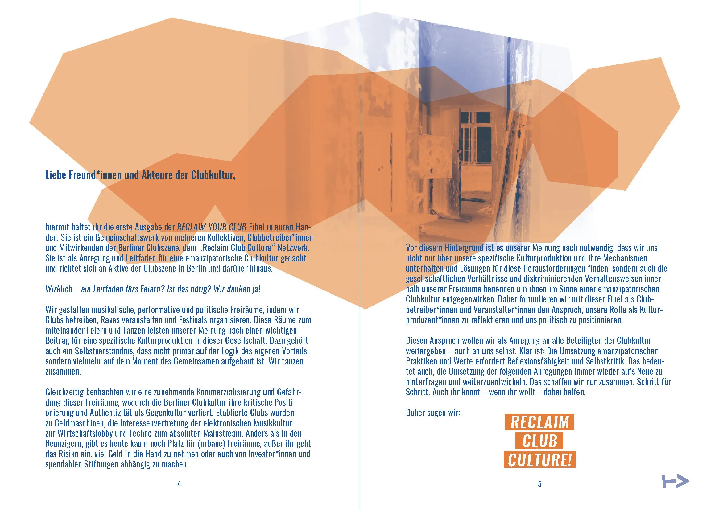 Die RECLAIM YOUR CLUB Fibel ist ein Gemeinschaftswerk von mehreren Kollektiven, Clubbetreiber*innen und Mitwirkenden der Berliner Clubszene, dem „Reclaim Club Culture“ Netzwerk. Sie ist als Anregung und Leitfaden für eine emanzipatorische Clubkultur gedacht und richtet sich an Aktive der Clubszene in Berlin und darüber hinaus.