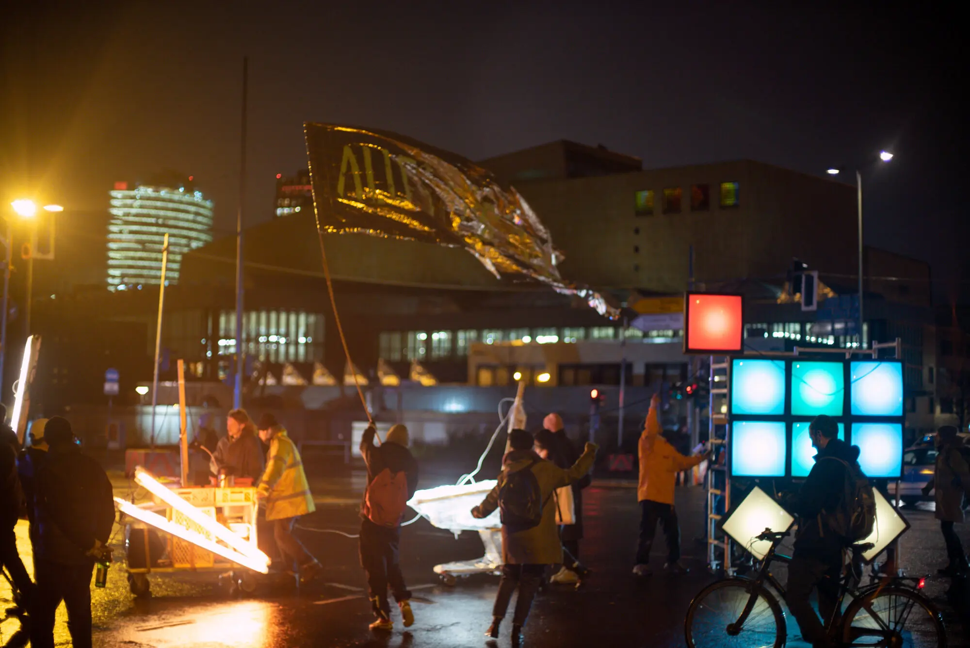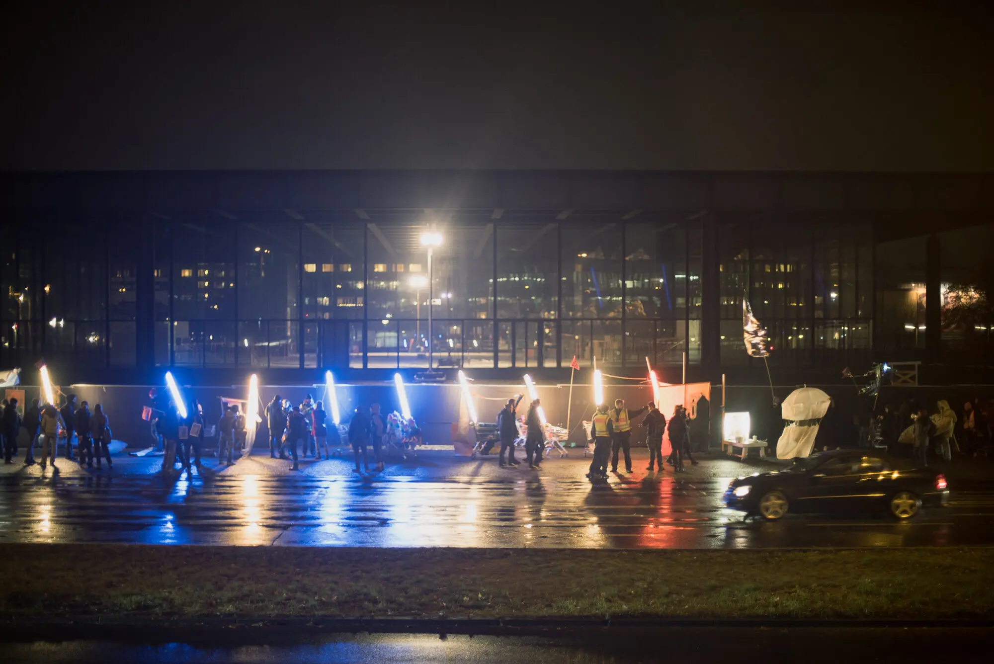 Wir gehen zur Neuen National Galerie, dem Symbol für überdimensioniertem, hoch subventioniertem Umbau und gemeinschaftlich toleriertem Leerstand. Heute ist der Platz für unsere Kunst noch die Straße – doch morgen wollen wir mehr. Die Kunst ist der „Forder“ Grund.