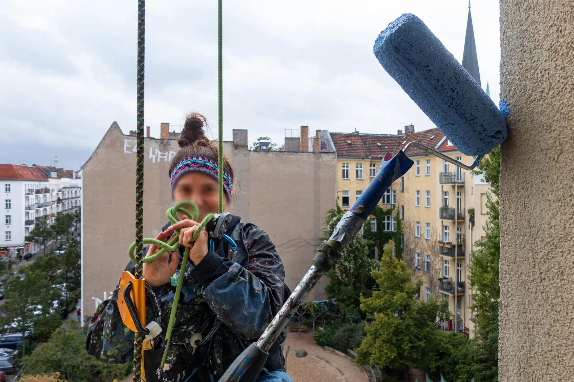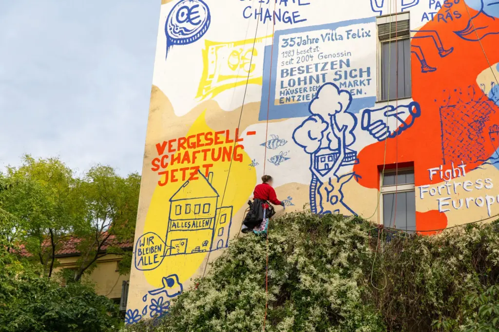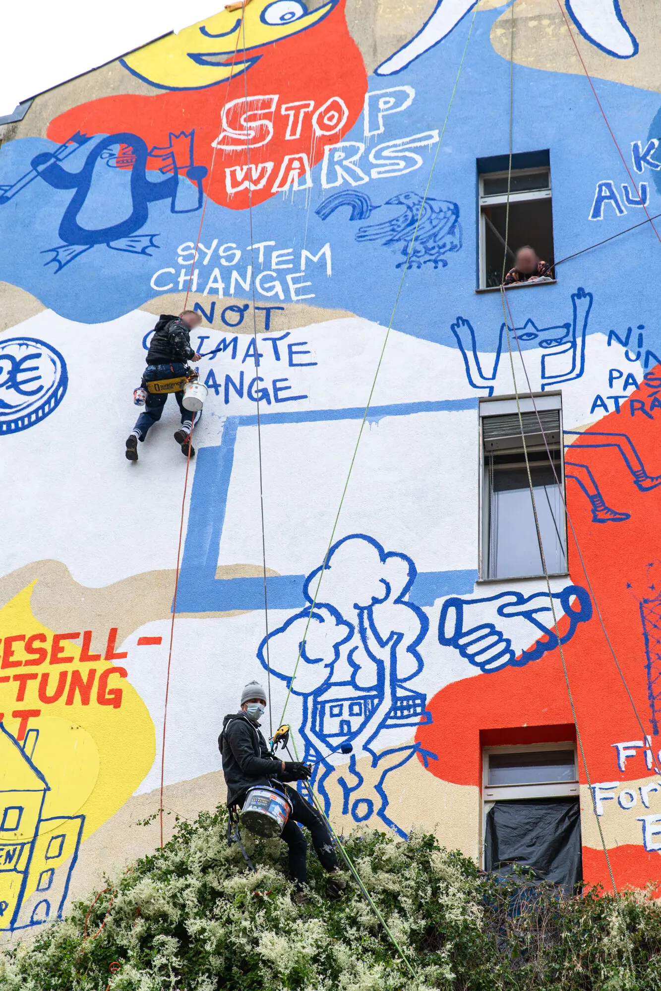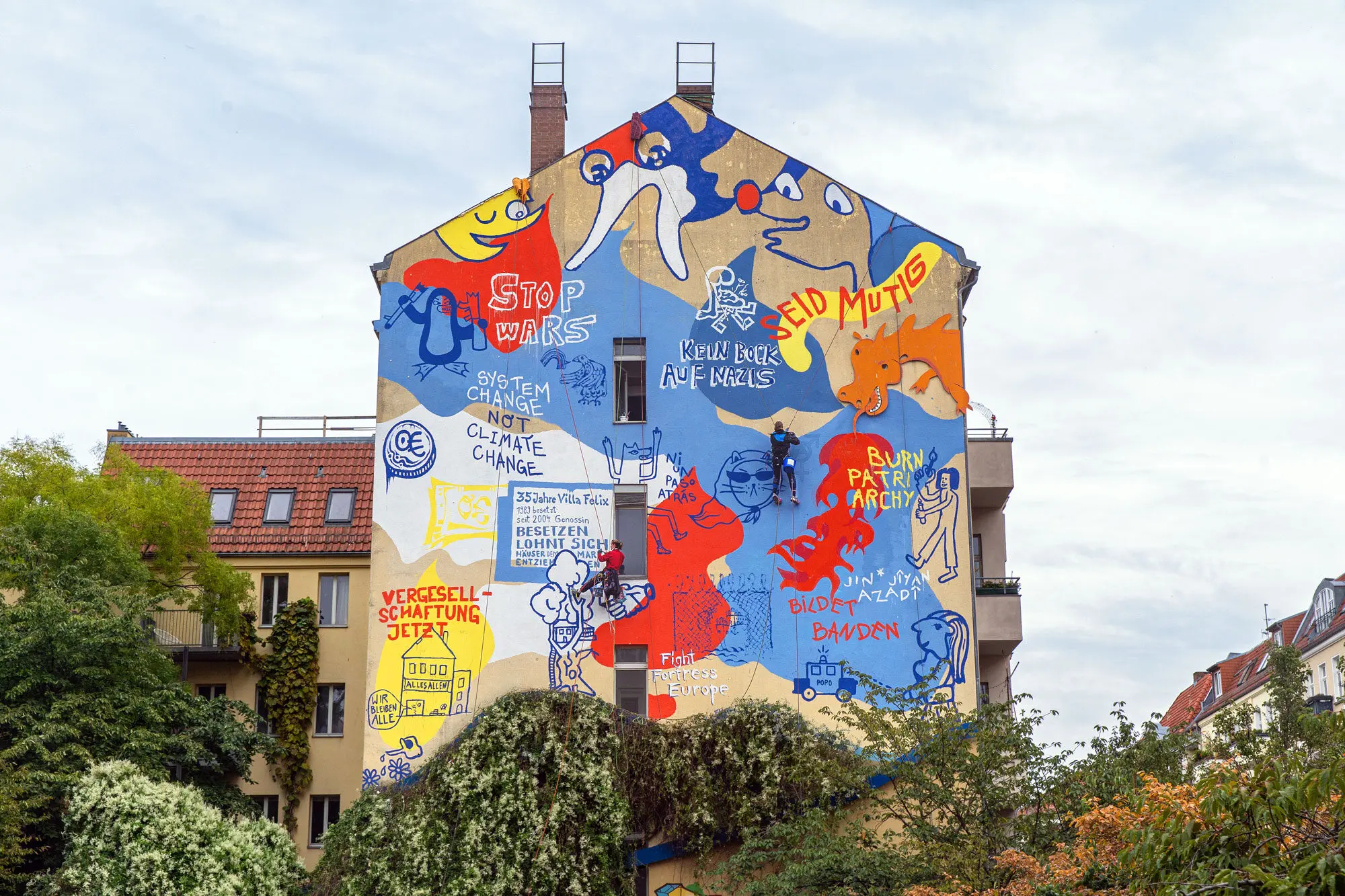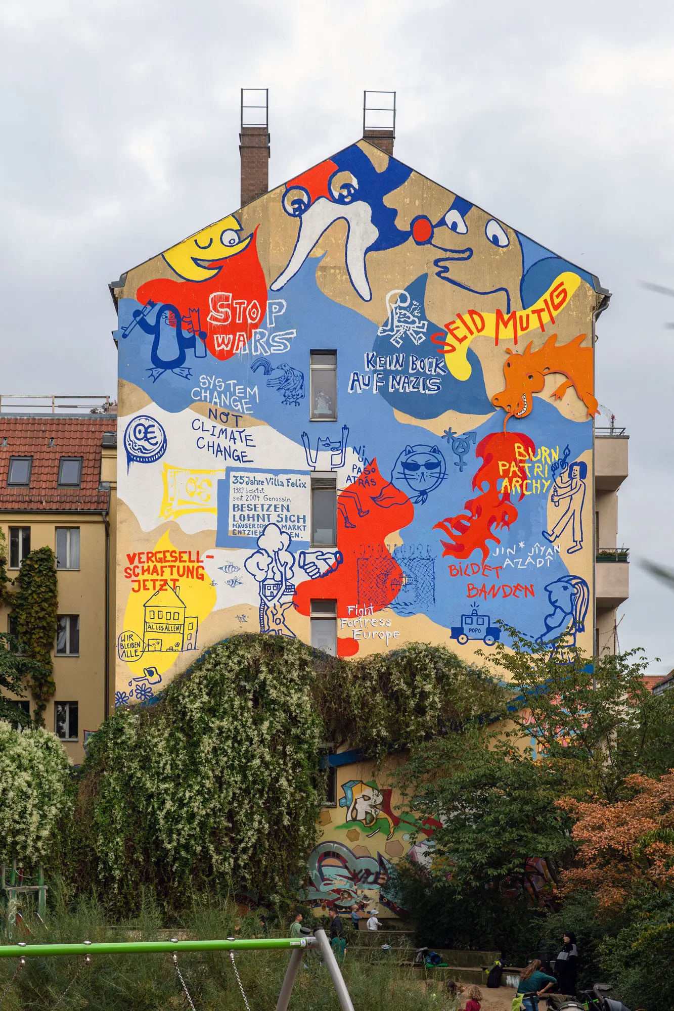 Der 35. Jahrestag der Hausbesetzung in der Schreinerstraße 47 in Berlin-Friedrichshain war Anlass für Künstlerinnen gemeinsam mit der Hausgemeinschaft deren Fassade neu zu gestalten. Die zentralen Inhalte und Bild-Motive haben die Bewohnerinnen entschieden. An diesem Wochenende feiern die Bewohner*innen ihren Hausgeburtstag.