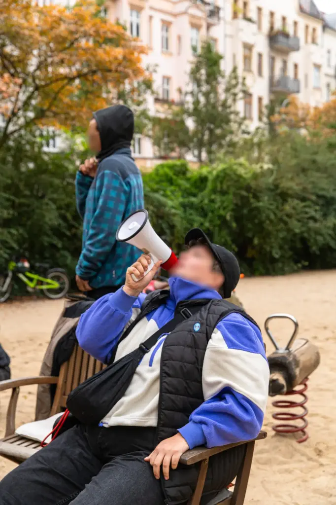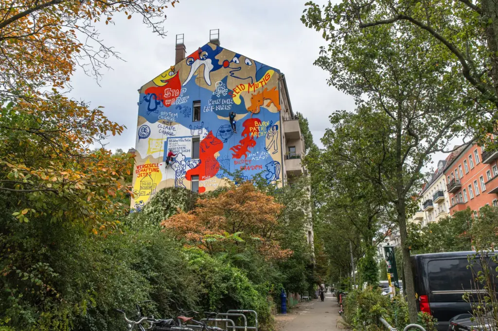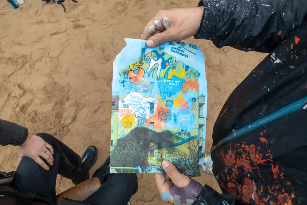 Das Wimmelbild gesellschaftlicher Utopien spiegelt die unterschiedlichen Themen wieder, mit denen sie sich innerhalb ihres Wohnprojekts auseinandersetzen: neben der praktischen Vergesellschaftung von Wohnraum z.B. Feminismus und Klimagerechtigkeit. Der finale Entwurf entstand nach mehreren offenen Treffen im Laufe des Sommers, auf denen Skizzen und Ideen zusammengetragen wurden.