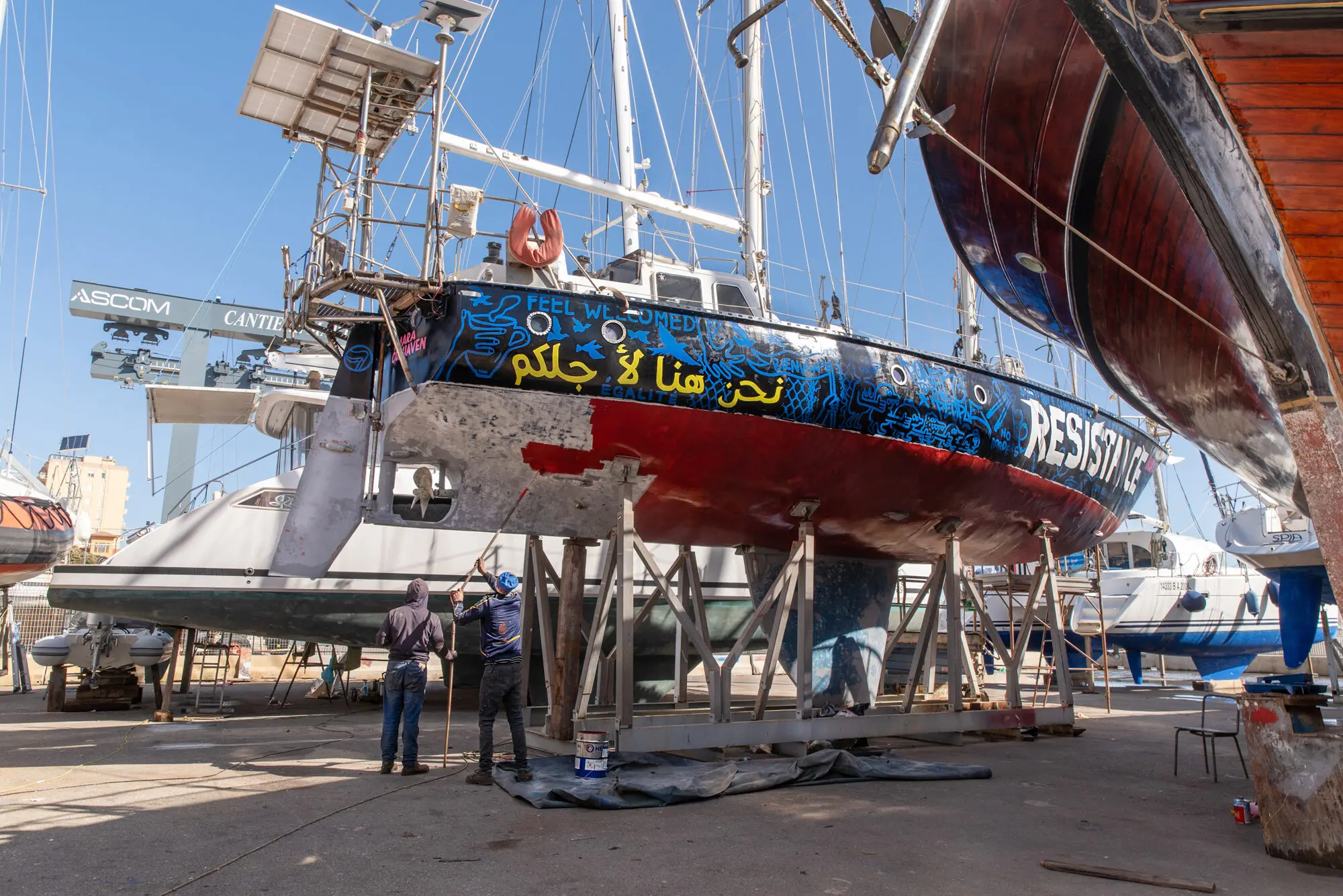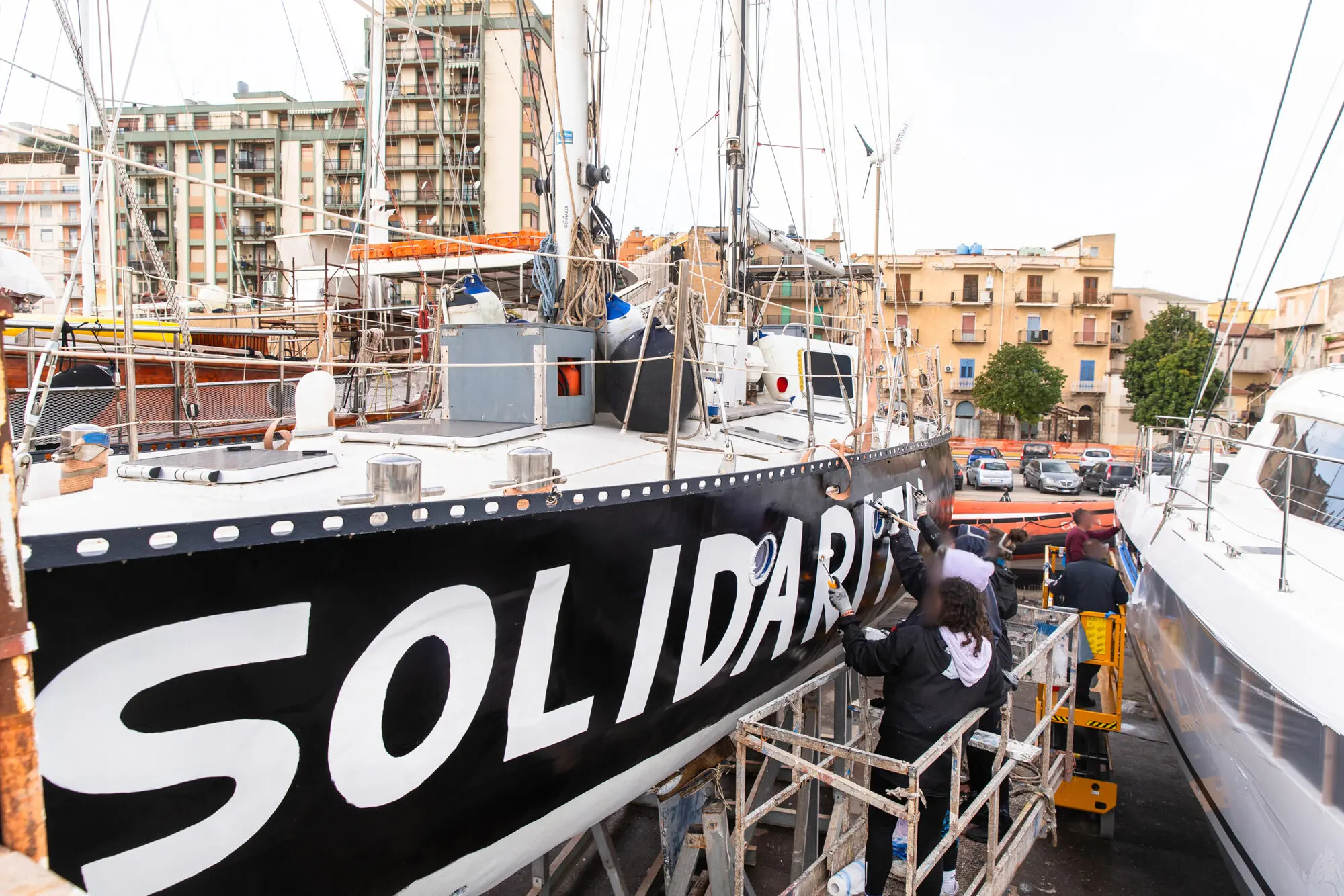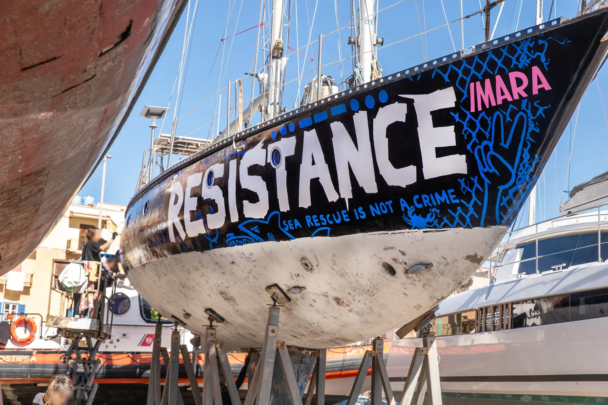 Am Hafen von Licata/Sizilien gestalteten Künstlerinnen und Aktivistinnen zusammen mit der Initiative r42 im Frühling 2024 das Seenotrettungsboot Imara. Die Bemalung des Bootes sollte den Inhalten der Seenotrettung mehr Sichtbarkeit geben und darauf aufmerksam machen, dass das Massensterben von Geflüchteten im Mittelmeer keine zufällige Tragödie ist. Sie ist Folge der politischen Entscheidung, die EU-Außengrenzen gewaltsam abzuschotten.