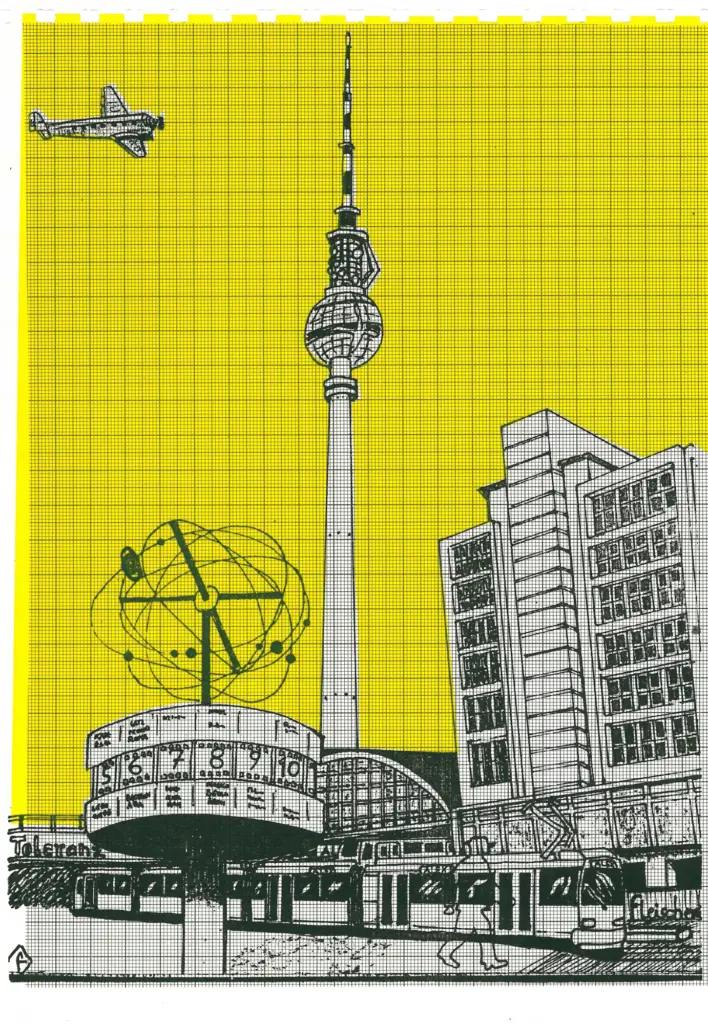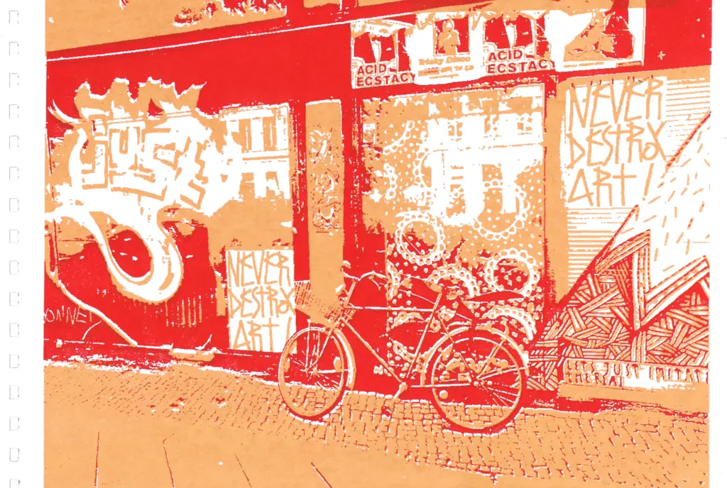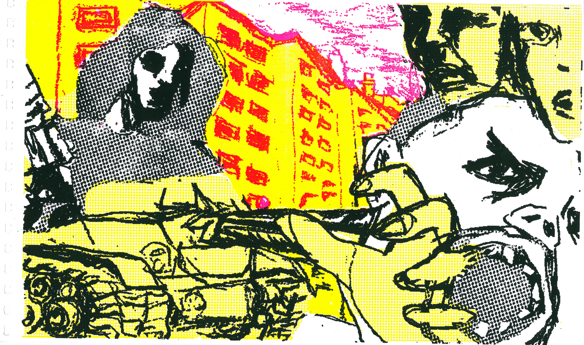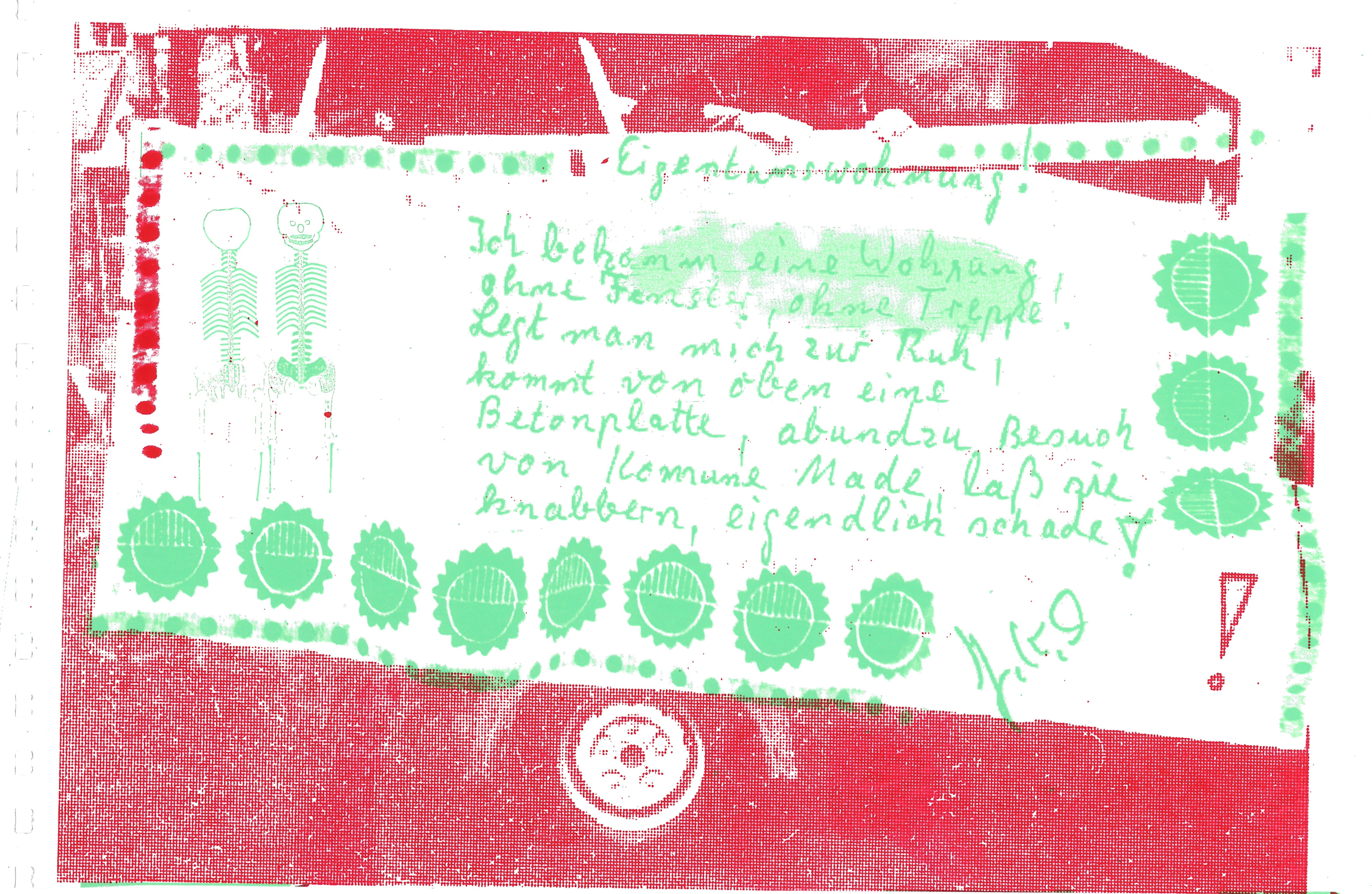 71 Siebdrucke von Künstler*innen aus dem Umfeld der Czentrifuga. Die Seiten wurden individuell in den verschiedenen Werkstätten gedruckt, auf unterschiedlichem Papier und schließlich mit Ringbindung als Buch zusammengebunden.