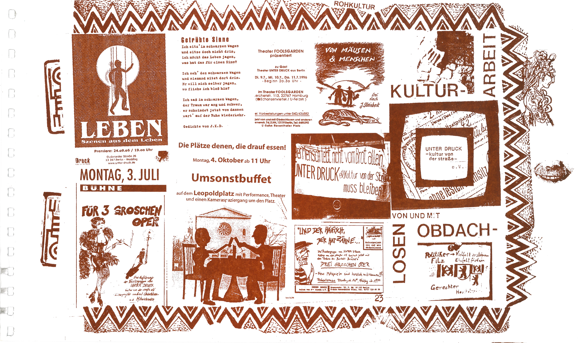 Kollektiv-Magazin zum 20jährigen Bestehen des Vereins »Unterdruck – Kultur von der Straße e.V.«, eine Selbsthilfe-Organisation für Obdachlose.