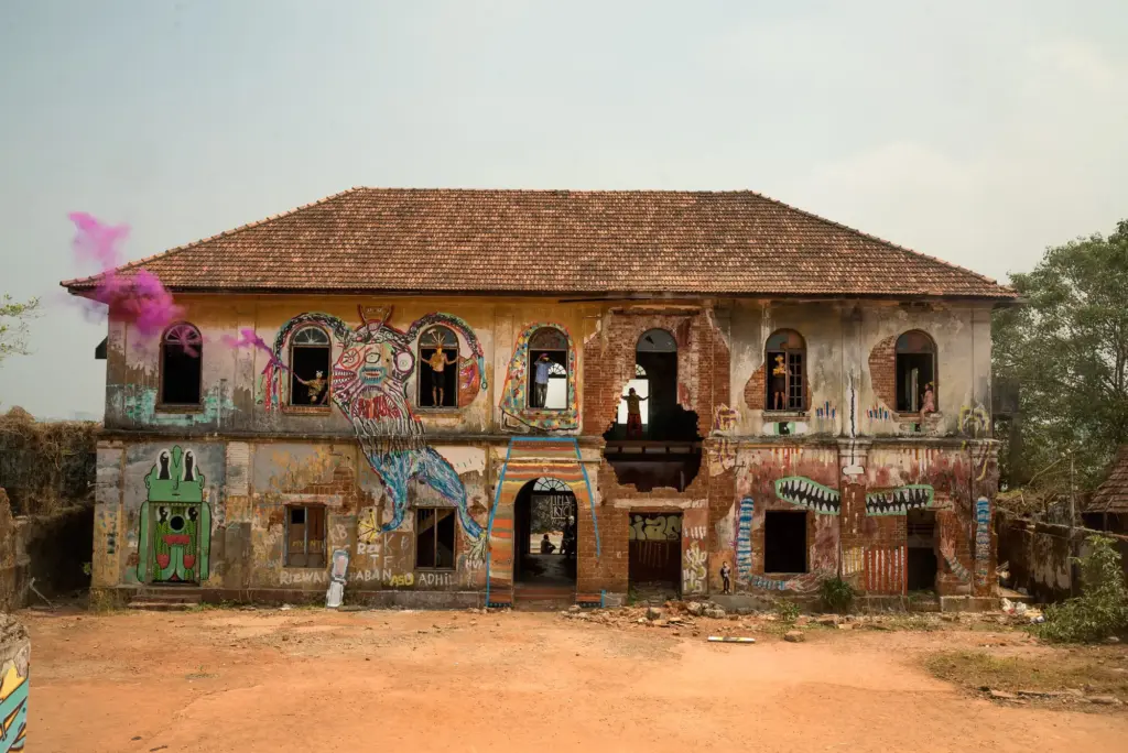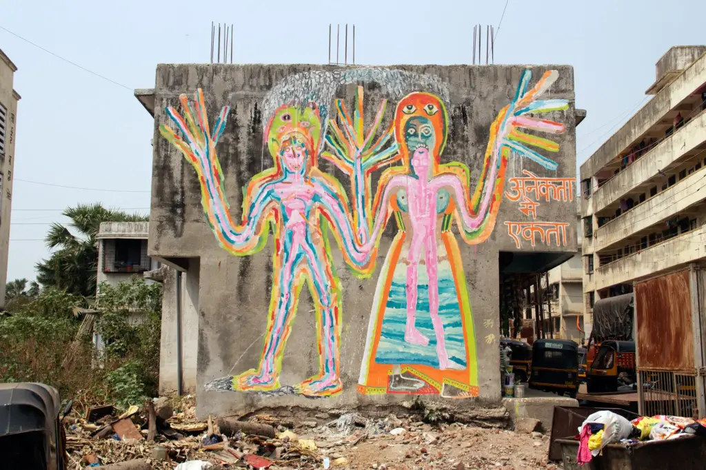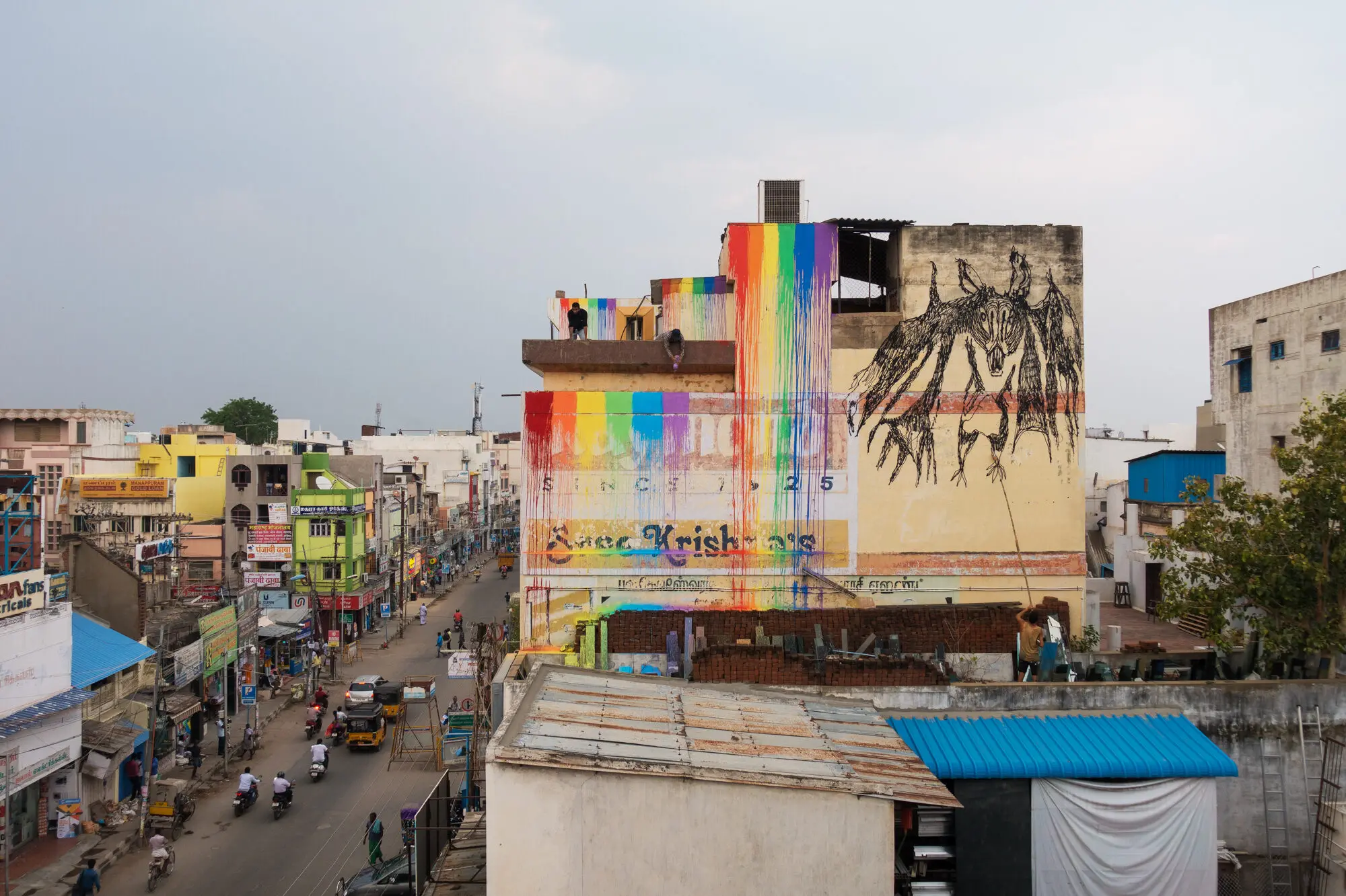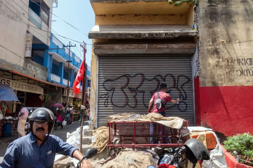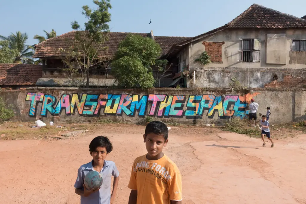 TFTS, a temporary collective of artists from Germany, Italy and India, swent to southern India in spring 2018 and spent three months travelling around the country by bus, painting as they went. They financed the trip with income from wall painting jobs, such as the mural for the new building of the newspaper TAZ in Berlin-Mitte. The money was used to pay paint and materials on the trip, as well for spontaneous fellow travellers or people who joined them in India, regardless of whether they had worked on the commissioned works. A film and a book project about the trip are in the planning.