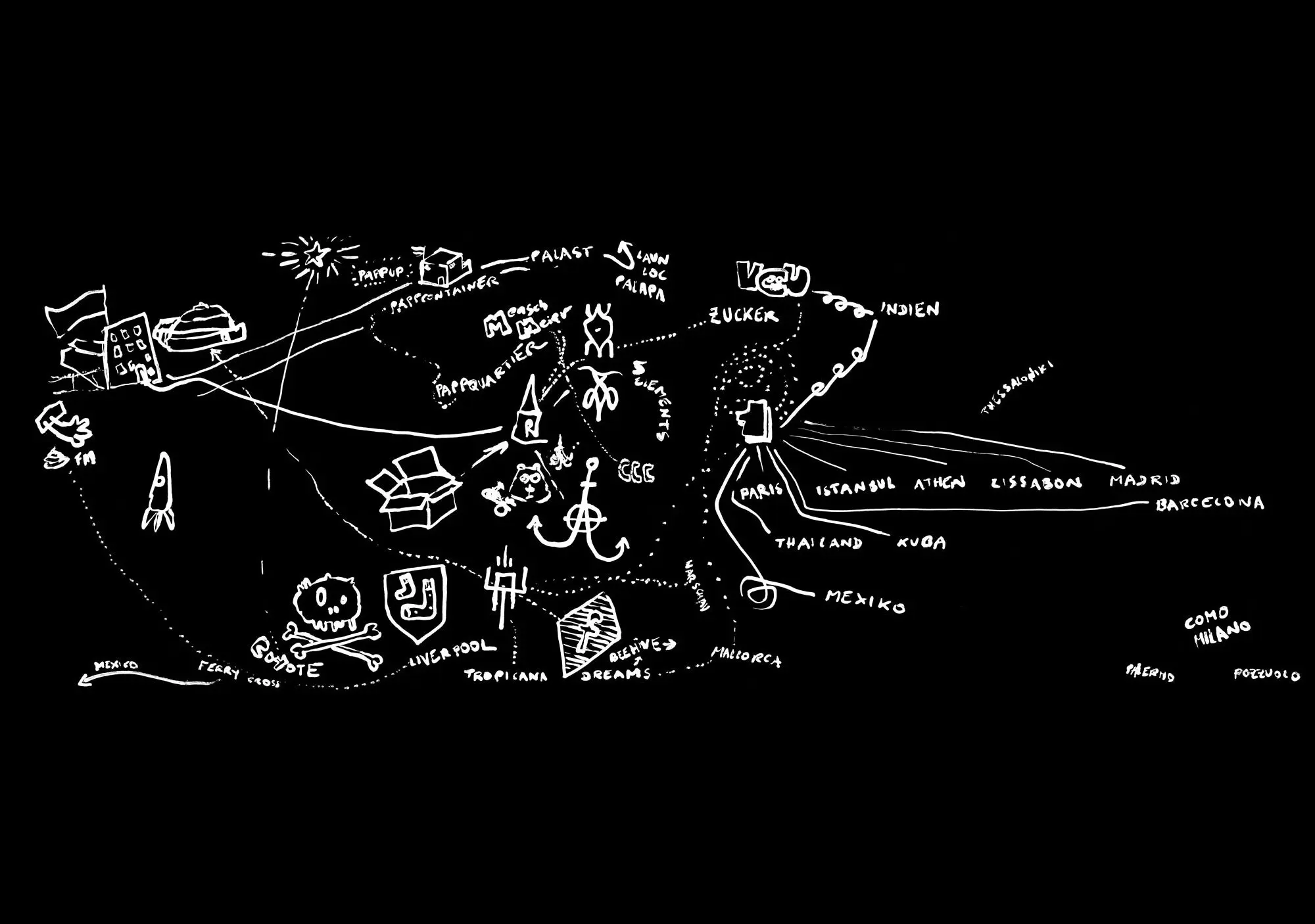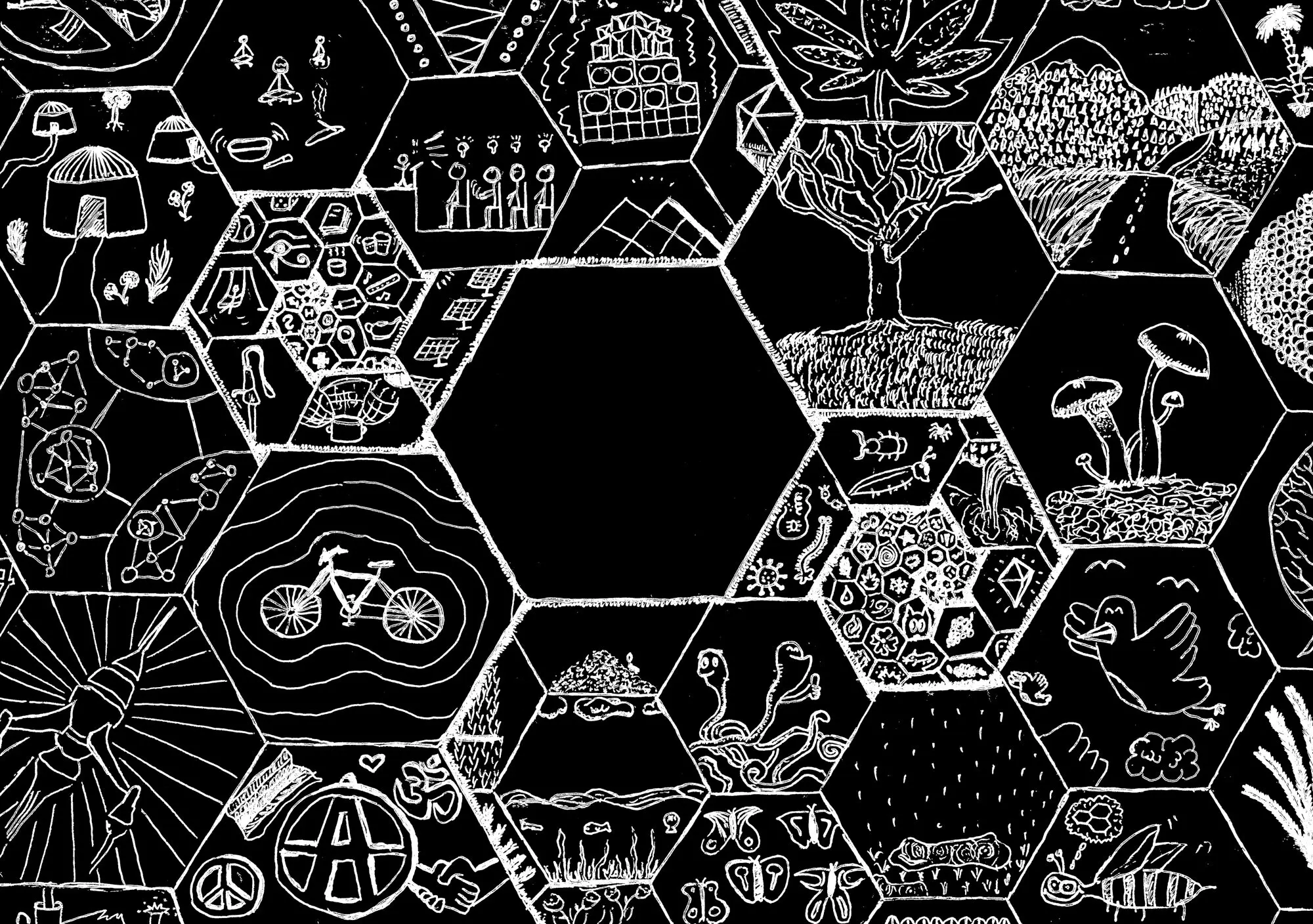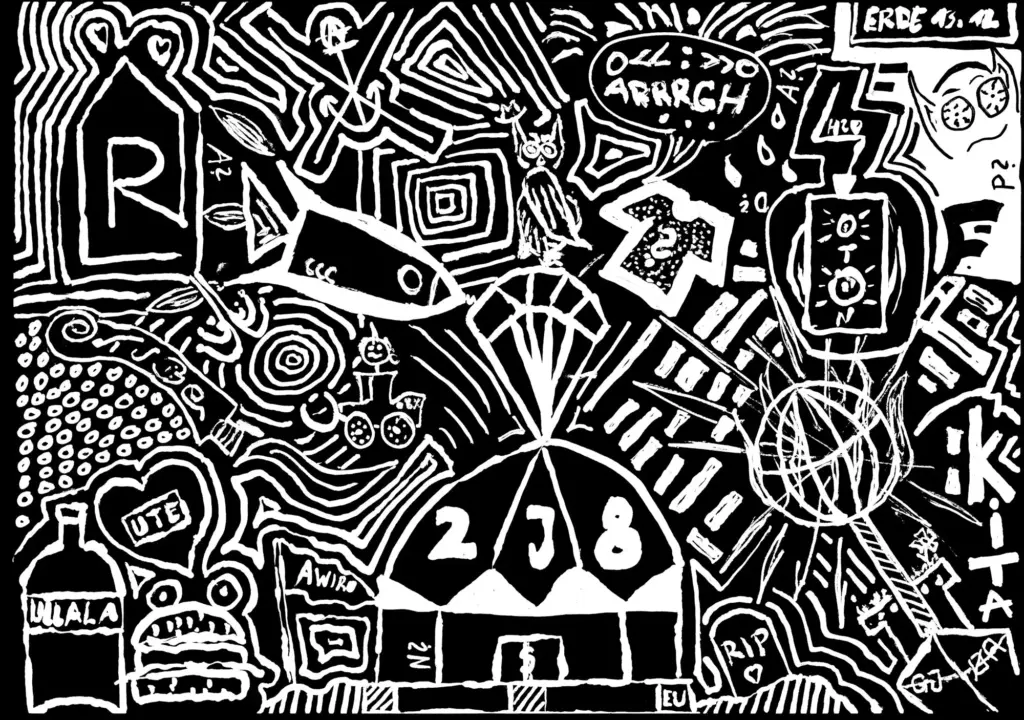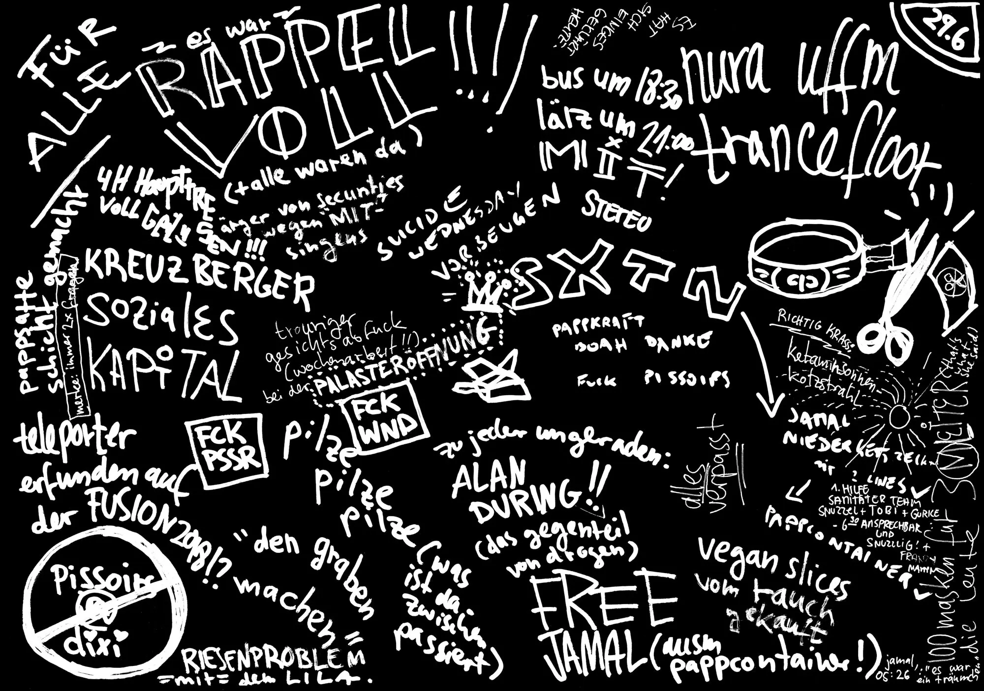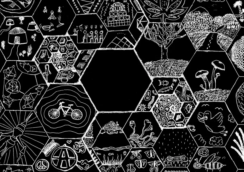 Auf der Fusion 2018 haben wir damit begonnen, Leuten, die in selbstorganisierten kulturellen und politischen Netzwerken aktiv sind, schwarze Papierbögen in die Hand zu drücken – mit der Aufgabe, ihre persönliche Idee von Utopie aufzuzeichnen. Wir haben deshalb schwarze Papierbögen mitgebracht, weil wir von ähnlichen Zeichenprojekten gehört hatten, dass Leute manchmal Angst vor dem weißen Blatt haben, aber bei einem schwarzen sofort mit dem Zeichnen anfangen können. Wichtig war uns auch, nicht nur Menschen einzubinden, die sich selbst als Künstlerinnen oder als professionelle Gestalterinnen verstehen. Deshalb war völlig freigestellt, ob die Bilder abstrakt sind oder z. B. einen konkreten Ort oder ein Netzwerk abbilden. Sie konnten auf Wunsch anonym abgegeben werden, und natürlich hat eine Zeichnung auch den Vorteil, dass Informationen darin verschlüsselt werden können, dass sie z. B. nur für den oder die Zeichner*in verständlich sind oder dass Informationen, die andere gefährden könnten, weggelassen oder phantasievoll ergänzt werden können.