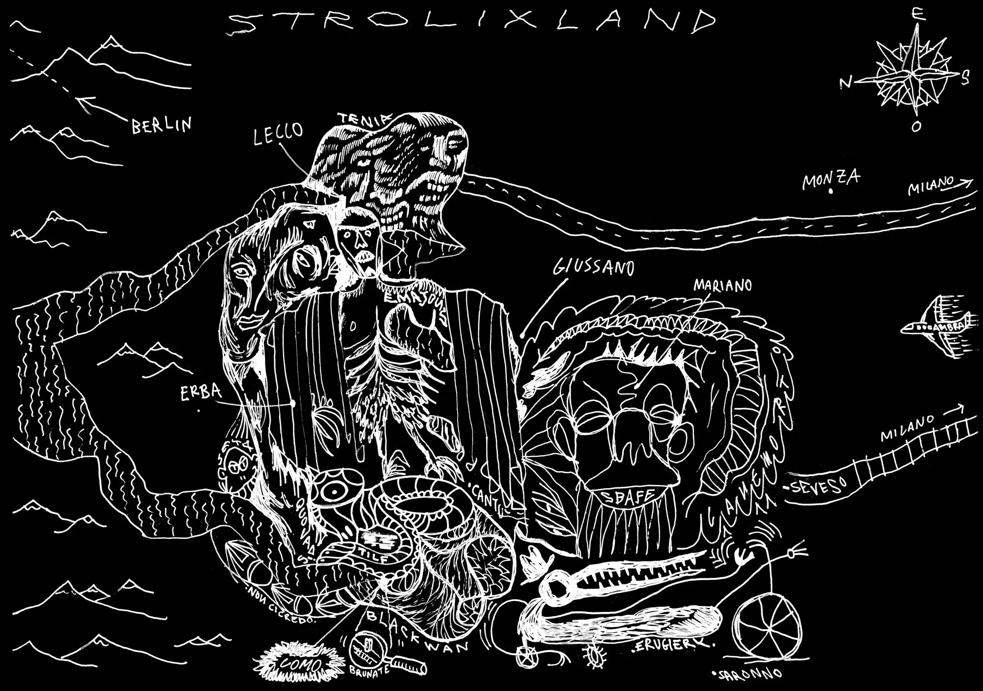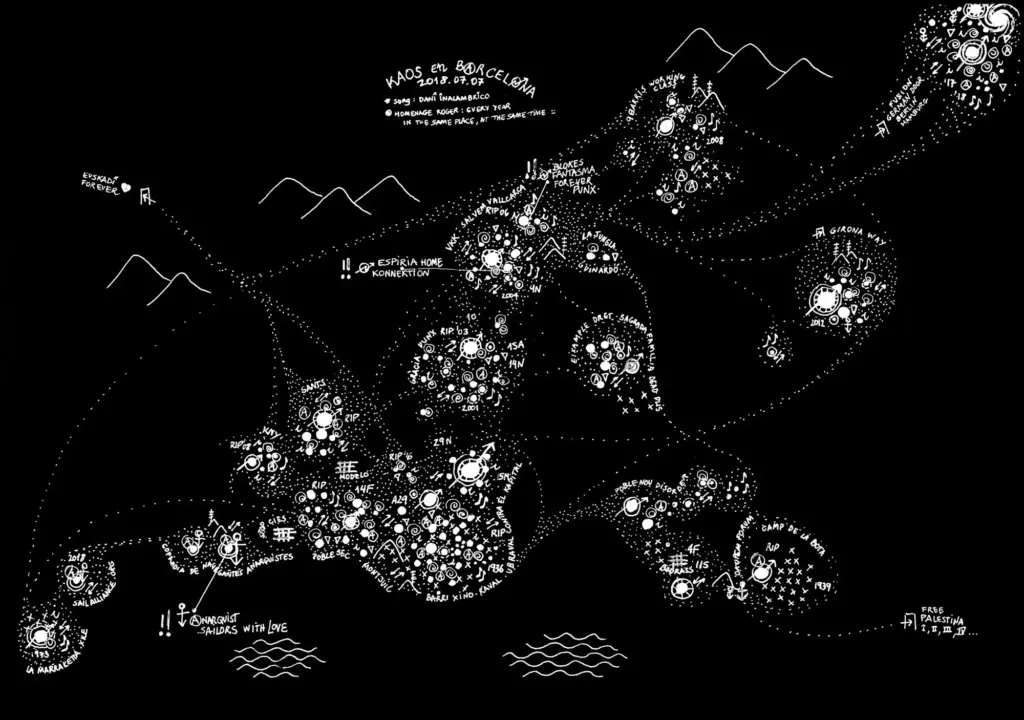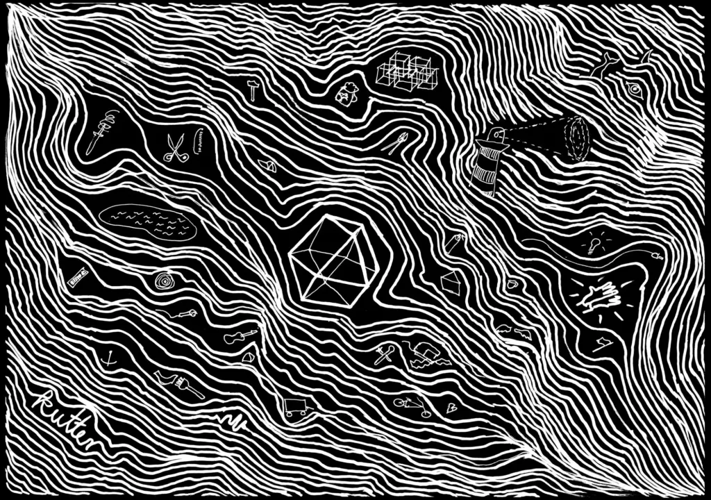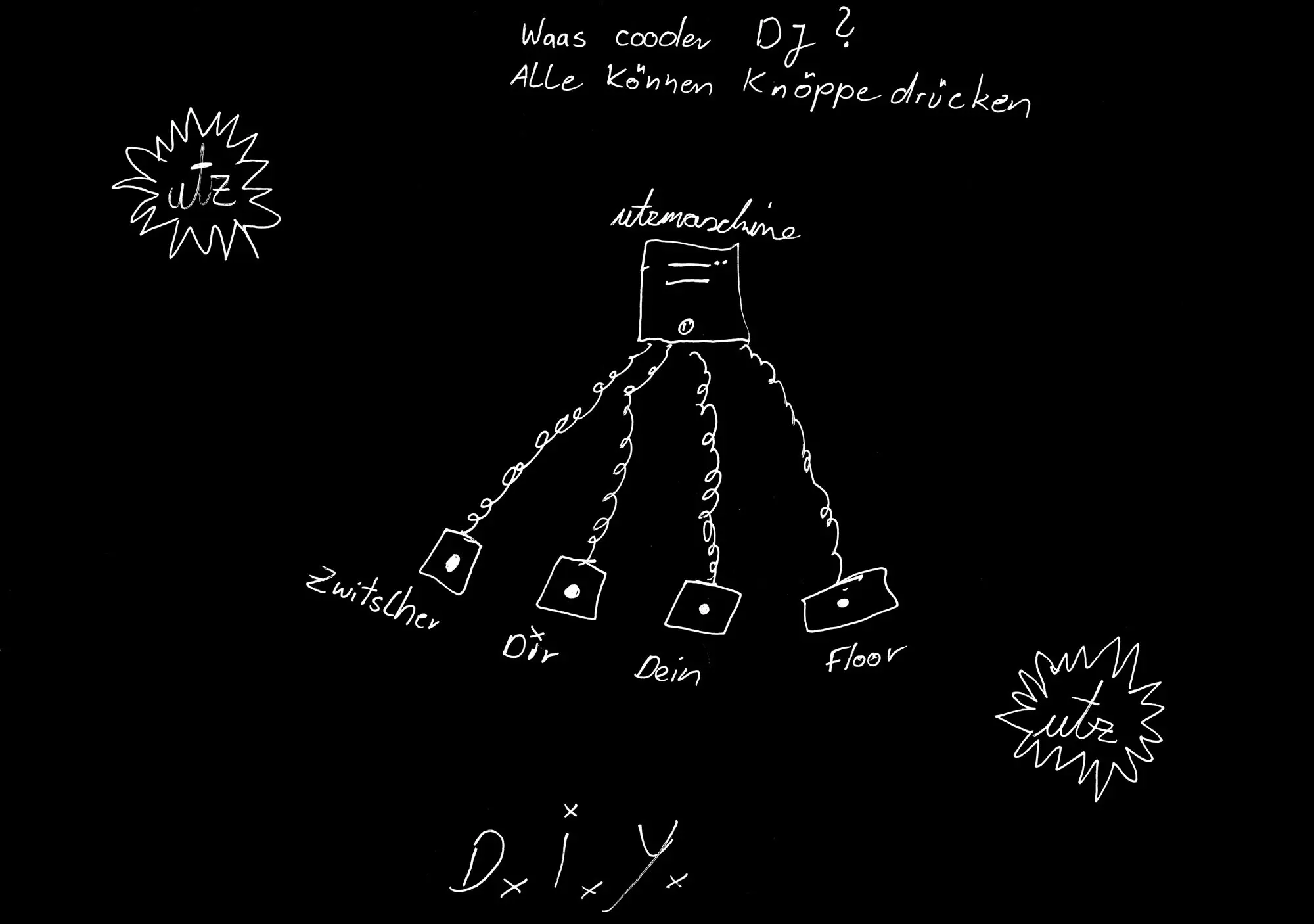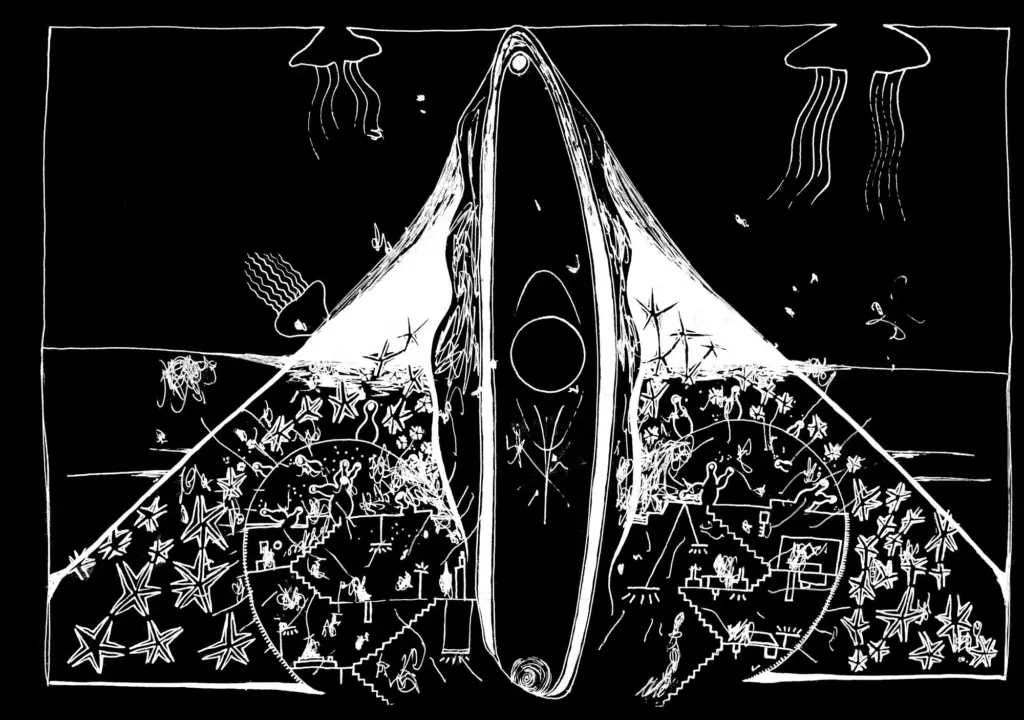 Auf der Fusion 2018 haben wir damit begonnen, Leuten, die in selbstorganisierten kulturellen und politischen Netzwerken aktiv sind, schwarze Papierbögen in die Hand zu drücken – mit der Aufgabe, ihre persönliche Idee von Utopie aufzuzeichnen. Wir haben deshalb schwarze Papierbögen mitgebracht, weil wir von ähnlichen Zeichenprojekten gehört hatten, dass Leute manchmal Angst vor dem weißen Blatt haben, aber bei einem schwarzen sofort mit dem Zeichnen anfangen können. Wichtig war uns auch, nicht nur Menschen einzubinden, die sich selbst als Künstlerinnen oder als professionelle Gestalterinnen verstehen. Deshalb war völlig freigestellt, ob die Bilder abstrakt sind oder z. B. einen konkreten Ort oder ein Netzwerk abbilden. Sie konnten auf Wunsch anonym abgegeben werden, und natürlich hat eine Zeichnung auch den Vorteil, dass Informationen darin verschlüsselt werden können, dass sie z. B. nur für den oder die Zeichner*in verständlich sind oder dass Informationen, die andere gefährden könnten, weggelassen oder phantasievoll ergänzt werden können.