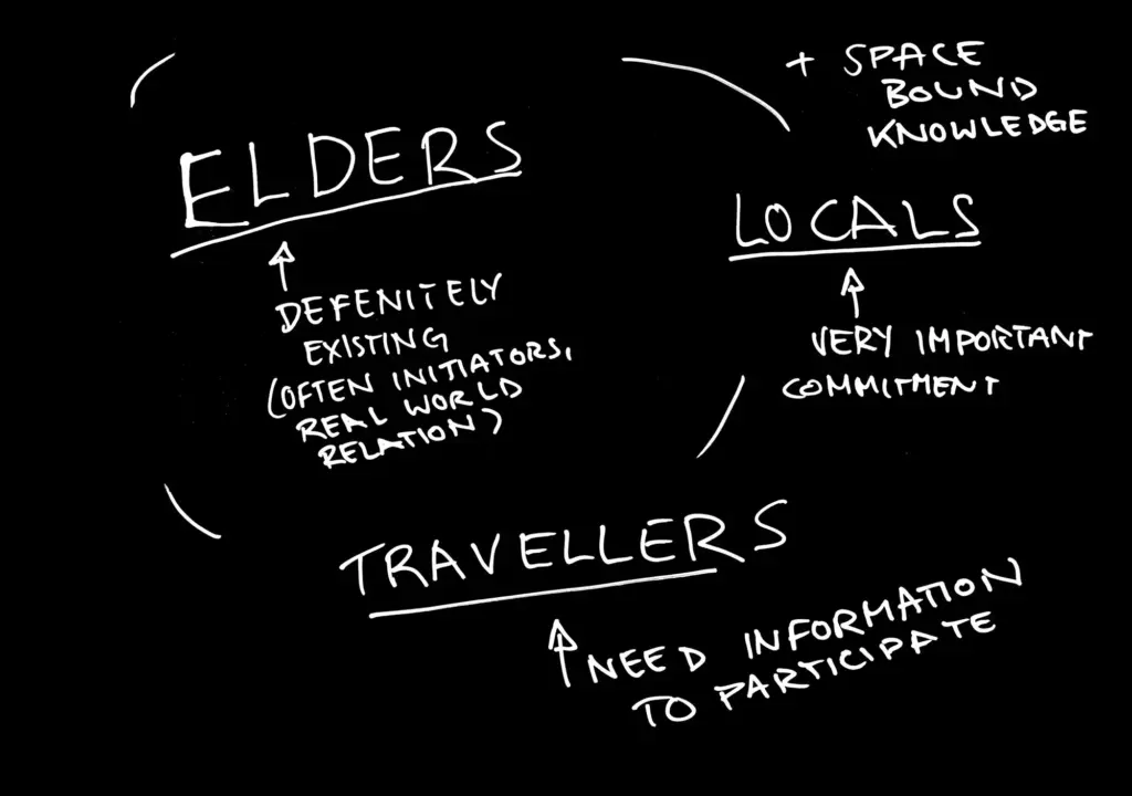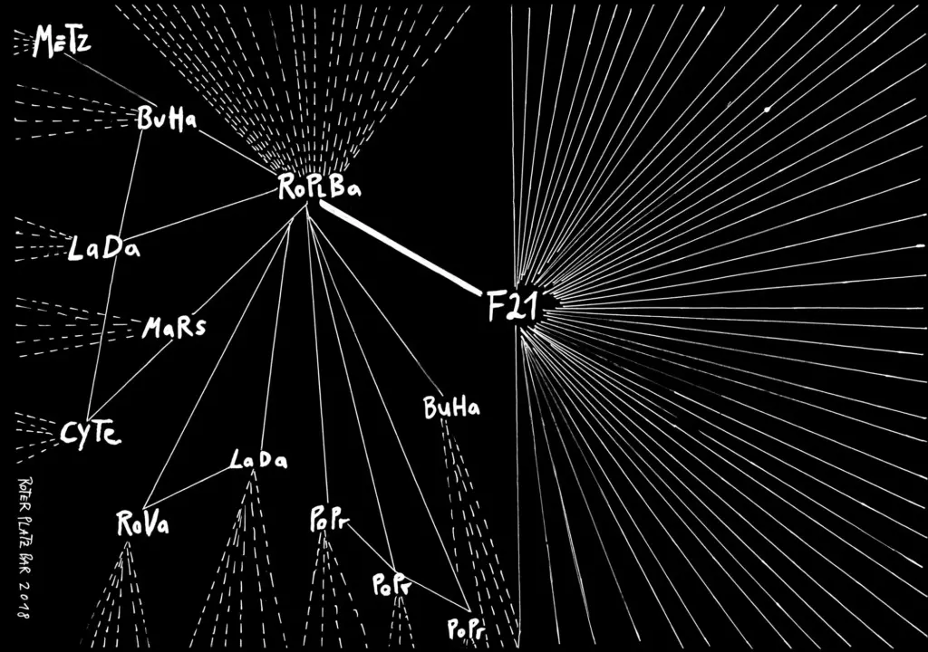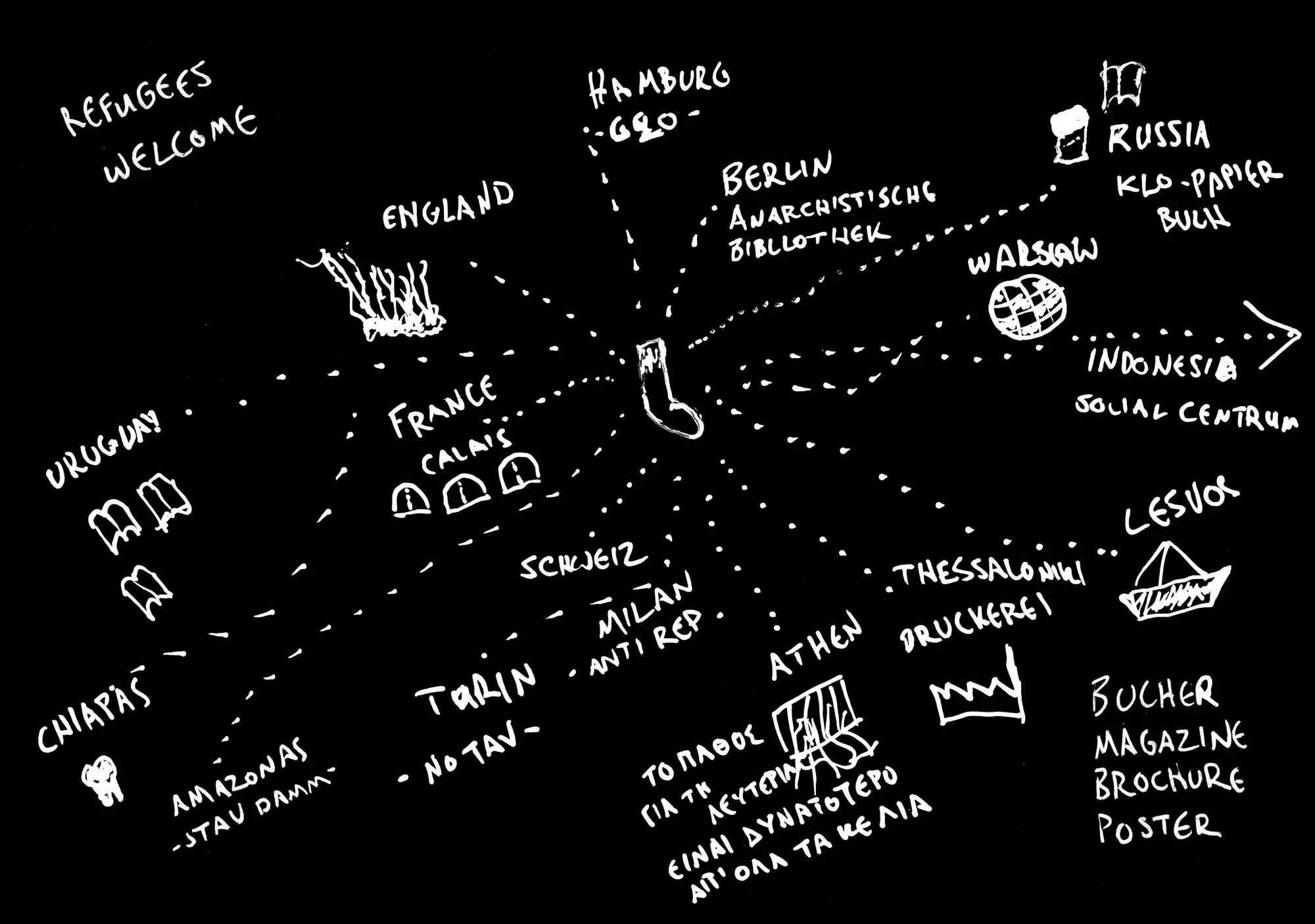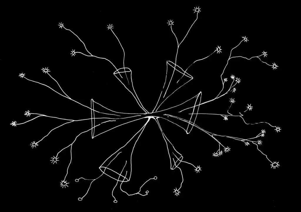 In vielen gemeinsamen Gesprächen und Überlegungen mit Menschen aus den Kollektiven, die in diesem Buch beschrieben sind, kam immer wieder dieselbe Vermutung auf: dass die »Kunst« an unseren jeweiligen Aktivitäten weniger die Werke sind, die am Ende herauskommen, sondern vielmehr die Verbindungen und Strukturen, die zwischen uns entstehen, und die gemeinsamen Erfahrungen, die wir auf dem Weg machen. Und dass wenn wir über Utopien sprechen wollen, es vielleicht interessant wäre, die Strukturen zu visualisieren.