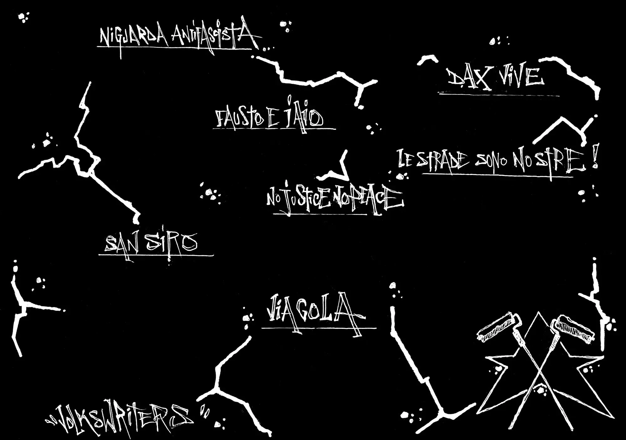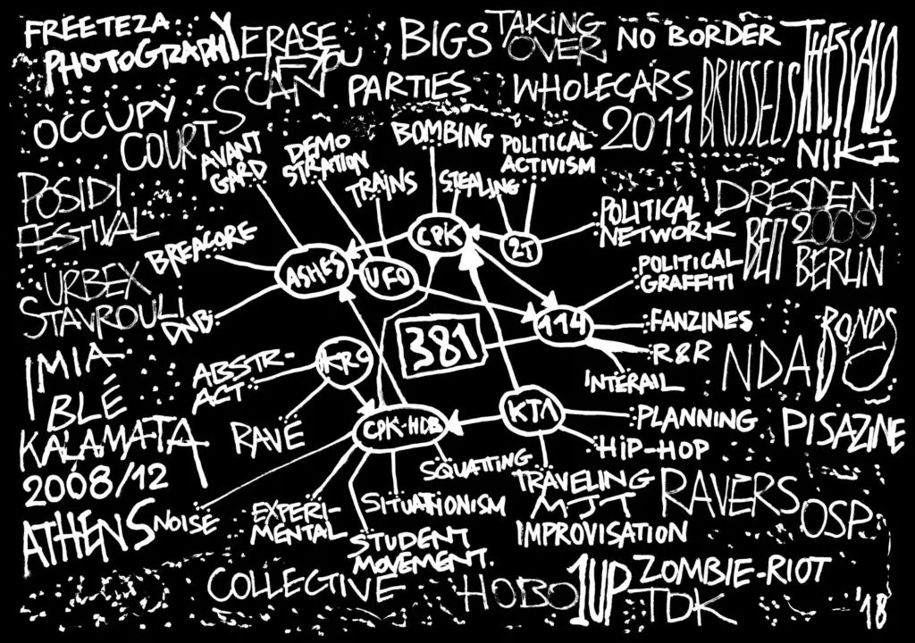 T: These drawings came out of the discussions we had in different collectives. When I talk about “collective”, when I talk about “we”, it’s always hard to grasp who “we” actually are. We are people who work in the streets and who believe that art, design, dance, music are tools to make a difference, or at least to express ourselves politically. One of these “we’s” is the former art and media collective “Pappsatt”. But also, for example, “Reclaim Your City”, a loose network of artists and cultural activists who are involved in urban politics.