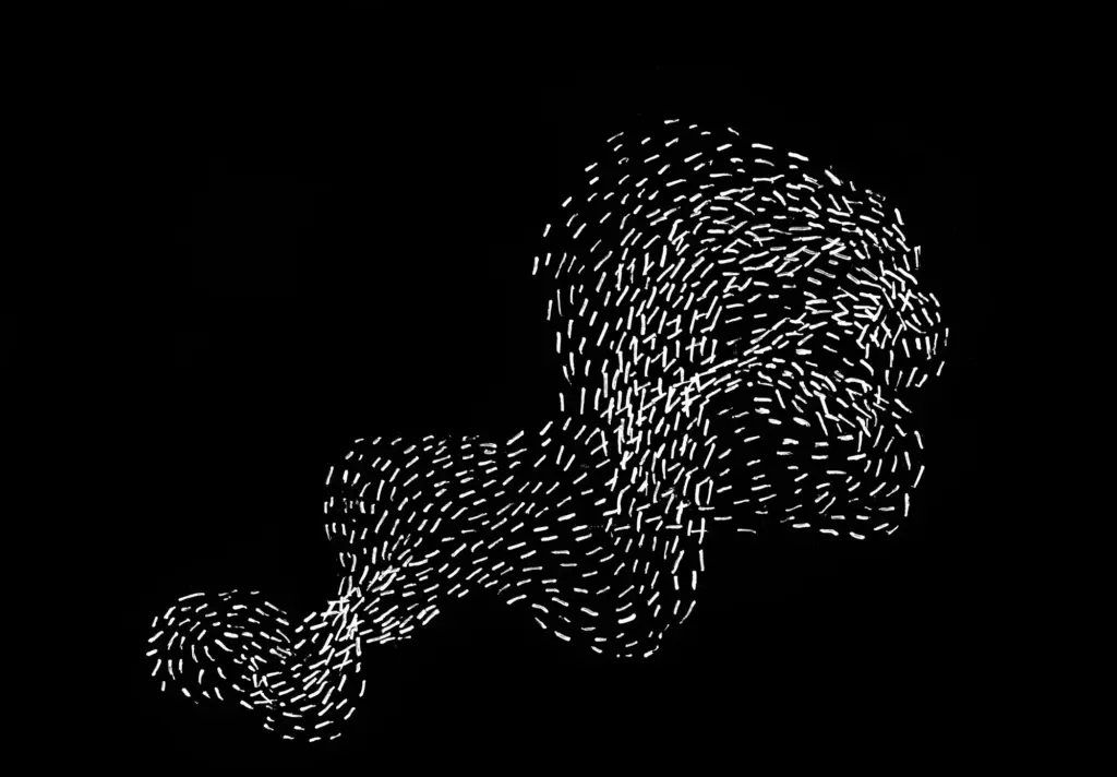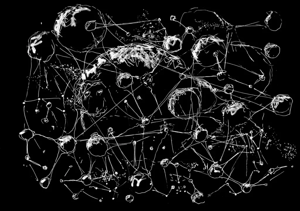 Aus den Überlegungen worin wir eine utopische Perspektive in unseren jeweiligen Aktivitäten sehen, kam die Idee, diese Verbindungen und Strukturen zu visualisieren. Denn für mich sind sie Vorstellungen von Widerstand gegen diese Wirklichkeit, wie sie jetzt ist, und von Utopien, wie es sein könnte. Ich habe auf der Fusion 2018 damit angefangen Leuten, die in selbstorganisierten kulturellen und politischen Netzwerken sind, schwarze Papierbögen in die Hand zu drücken, mit der Aufgabe mir ihre persönliche utopische Struktur zu zeichnen und diese Zeichnungen zu sammeln. Ich habe deshalb schwarze Papierbögen mitgebracht, weil ich gehört hatte, dass Leute manchmal Angst vor dem weißen Blatt haben, aber bei einem schwarzen sofort mit dem Zeichnen anfangen können. Mir war wichtig, dass ich nicht nur Menschen einbinde, die sich selbst als Künstler*innen oder als professionelle Gestalter verstehen.
