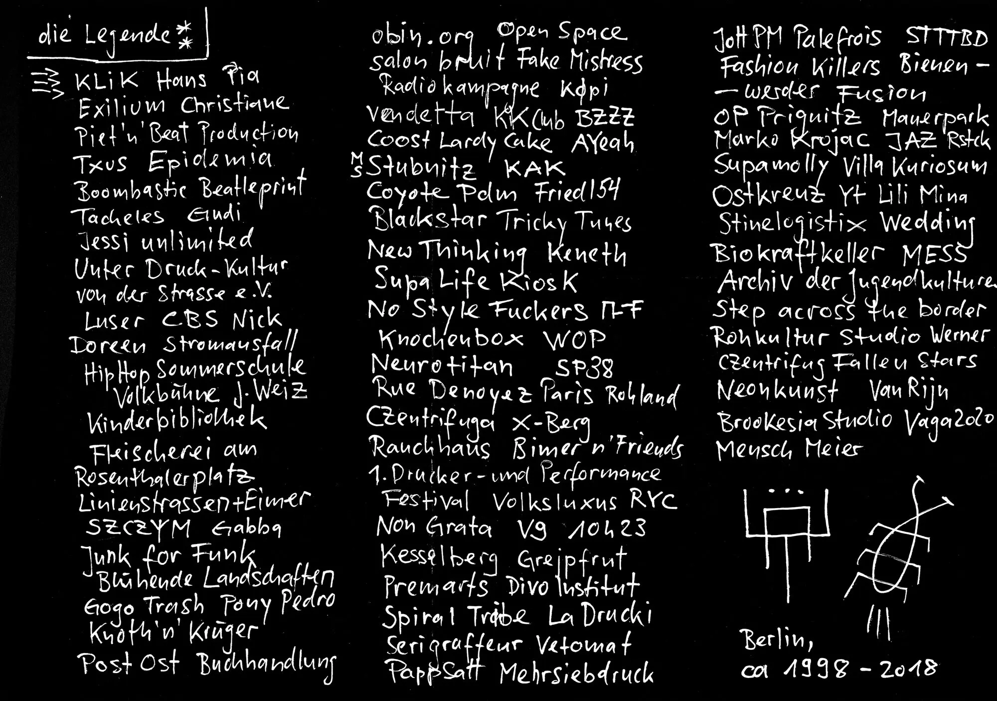 Beat (Czentrifuga), Anias Meier (Mensch Meier), Malvina (Freunde der Tulpe im Dreieck), Hartl Konopka (Maos Rache), Mader Beinhoff (Krachtigal), Don Morkone (Volkswriterz), Michelle (Liverpool), Karl Kutter (Fusion), Roter Platz (Fusion), Luftschloss (Fusion), Späti-Crew (Fusion), Canemorto, Coletivo ArdePixo, Lena Ziyal, Fiffi Zent, J. Pappe (Pappsatt), Rora, Tilf, Ema Jons, Sbrama, Hoffnung3000, Stella Förster, Bhima, Xaviera Vilamitjana de la Cruz, Mira Wunderer, Kathia von Roth, Felix Dreesen, Psyllos, Tommy Ryan, Matthias Wermke, Werner Brunner (Ex-Ratgeb).