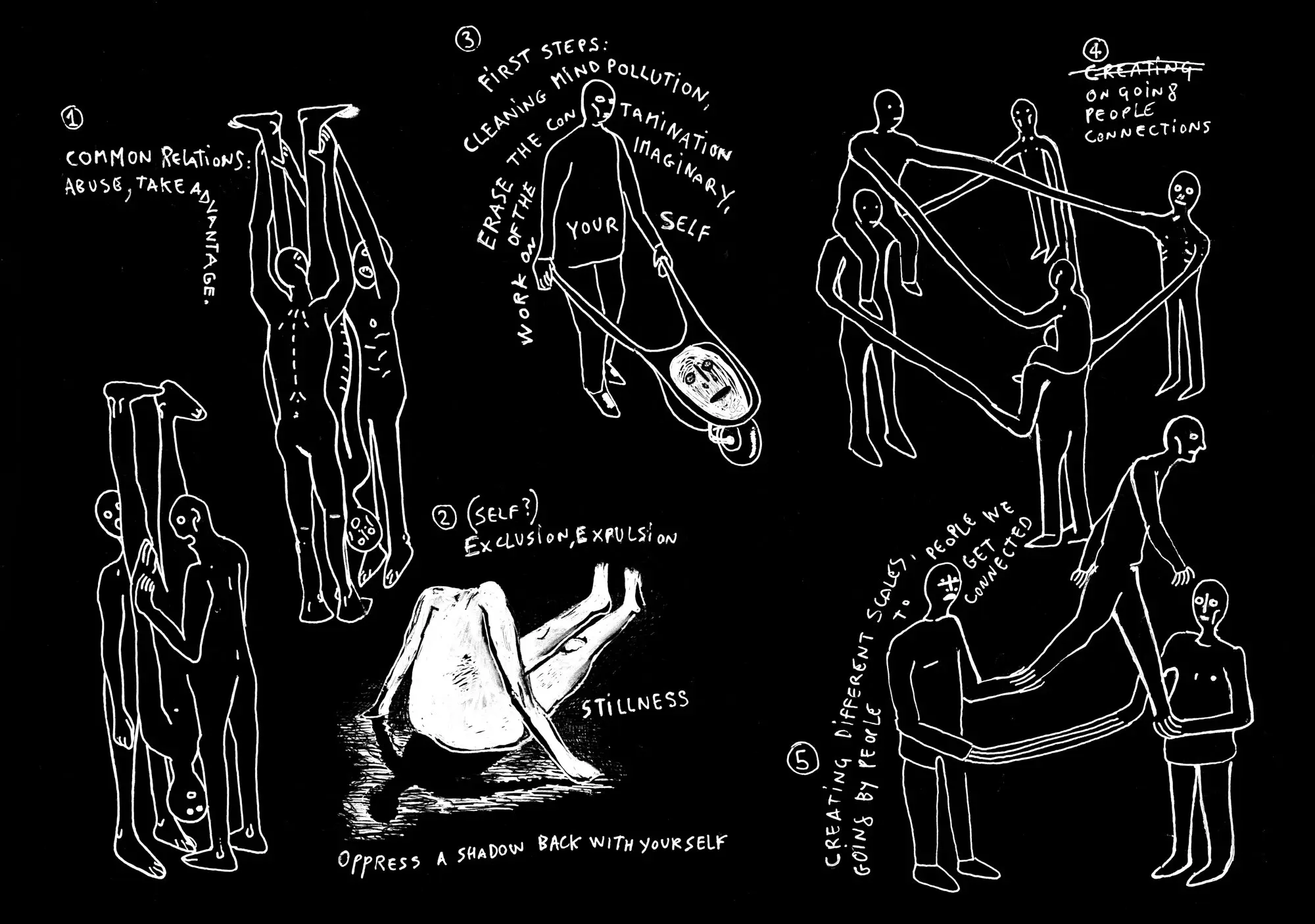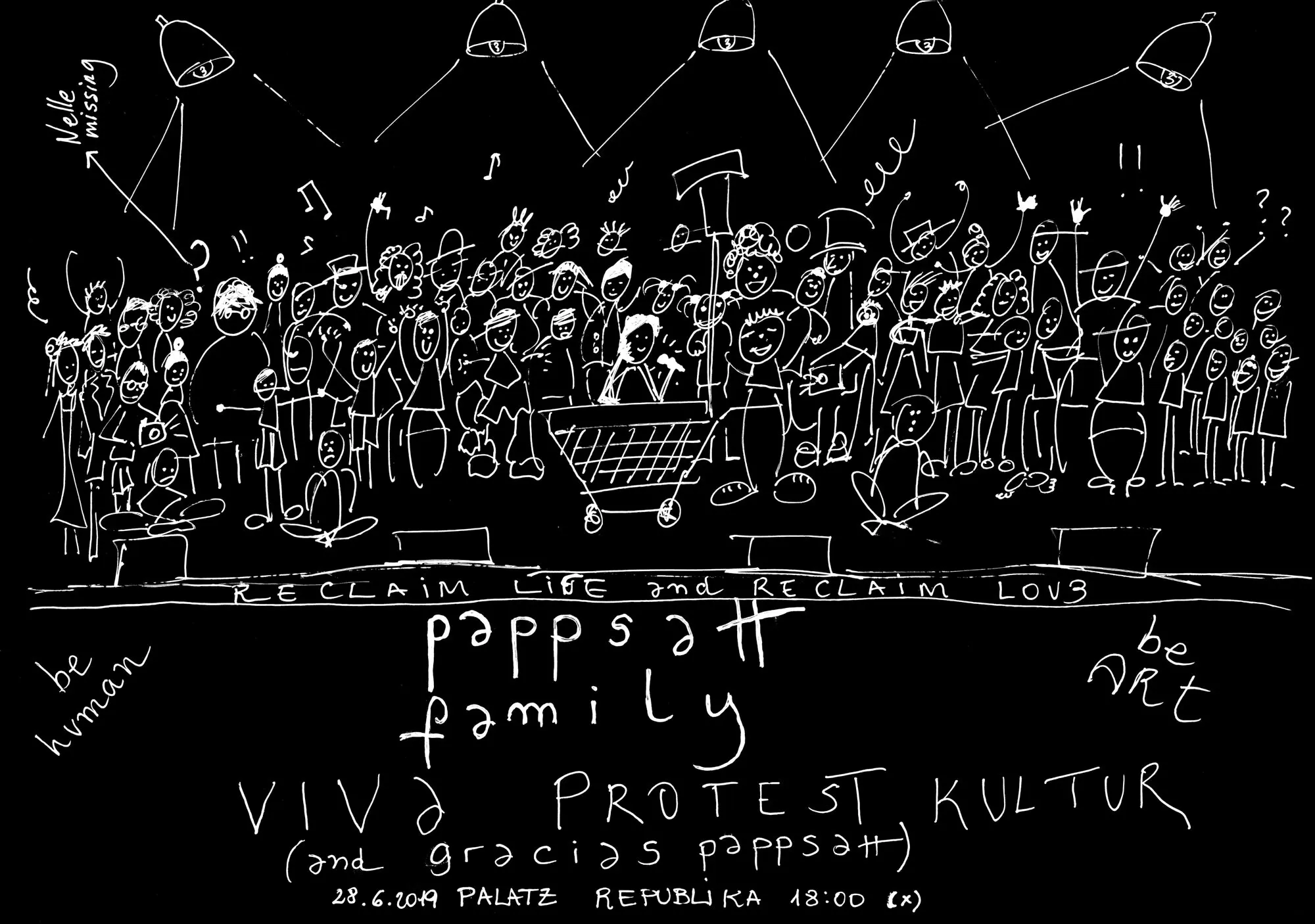 T: Diese Zeichnungen sind aus den Diskussionen entstanden, die wir in verschiedenen Kollektiven hatten. Wenn ich von „Kollektiv“ spreche, wenn ich von „wir“ spreche, dann ist immer schwer zu fassen, wer „wir“ eigentlich sind. Wir sind Leute, die auf der Straße arbeiten und die glauben, dass Kunst, Gestaltung, Tanz, Musik ein Werkzeug sind, um etwas zu verändern oder zumindest um sich politisch auszudrücken. Eines dieser “Wir’s” ist das ehemalige Kunst- und Medienkollektiv „Pappsatt“. Aber auch z.B. “Reclaim Your City”, ein loses Netzwerk von Künstlerinnen und Kulturaktivistinnen, die sich stadtpolitisch engagieren. .