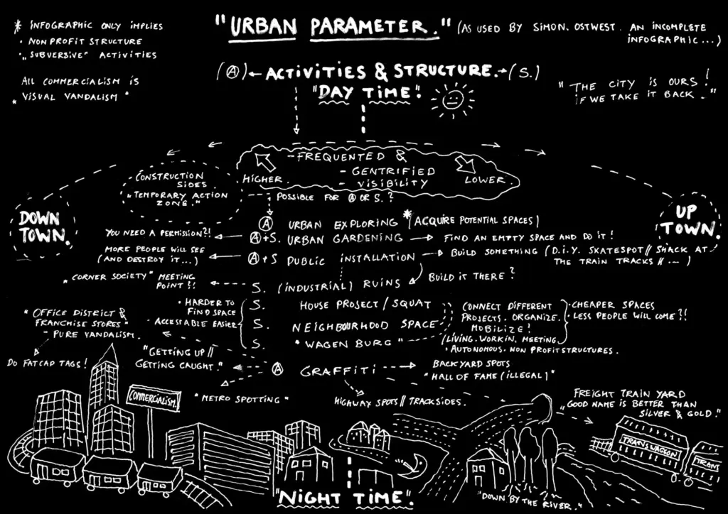 Die öfentliche Diskussion um die Gentrifizierung ab etwa 2008 zwang uns zu denken, dass wir mit dem, was wir tun, oft genau das Gegenteil von dem bewirken, was wir wollen. Es gab dazu verschiedene Ideen: mit Malen aufhören, oder alles, was wir in der Stadt gemalt hatten, schwarz und grau übermalen, was einige dann auch getan haben. Aber wollen wir die Stadt, in der wir leben, weniger schön oder sogar noch hässlicher machen wegen irgendwelcher Investoren, denen es am Ende möglicherweise sogar egal ist, ob die Fassaden grau oder bunt sind? In diesen Diskussionen kamen wir darauf, dass das Utopische oder das Politische in dem, was wir tun, gar nicht so sehr darin liegt, welche Bilder wir malen. Sondern es liegt in den Netzwerken, die entstanden sind durch dieses Tun. Es liegt vielleicht darin, dass wir durch das viele Machen und Unterwegssein, z.B. Auf-Dächer-klettern, sich davon Abseilen, Partys-machen usw. auch ein Wissen austauschen über die Methoden, wie man sich ausdrücken kann in der Stadt, wie man zusammenkommen kann, wie man etwas gemeinsam unternimmt, ohne einen Kompromiss machen zu müssen mit marktwirtschaftlichen Regeln oder dem Staat, mit den Geschäften, Gastronomieketten, der Unterhaltungsindustrie, der Medienindustrie, mit all dem…